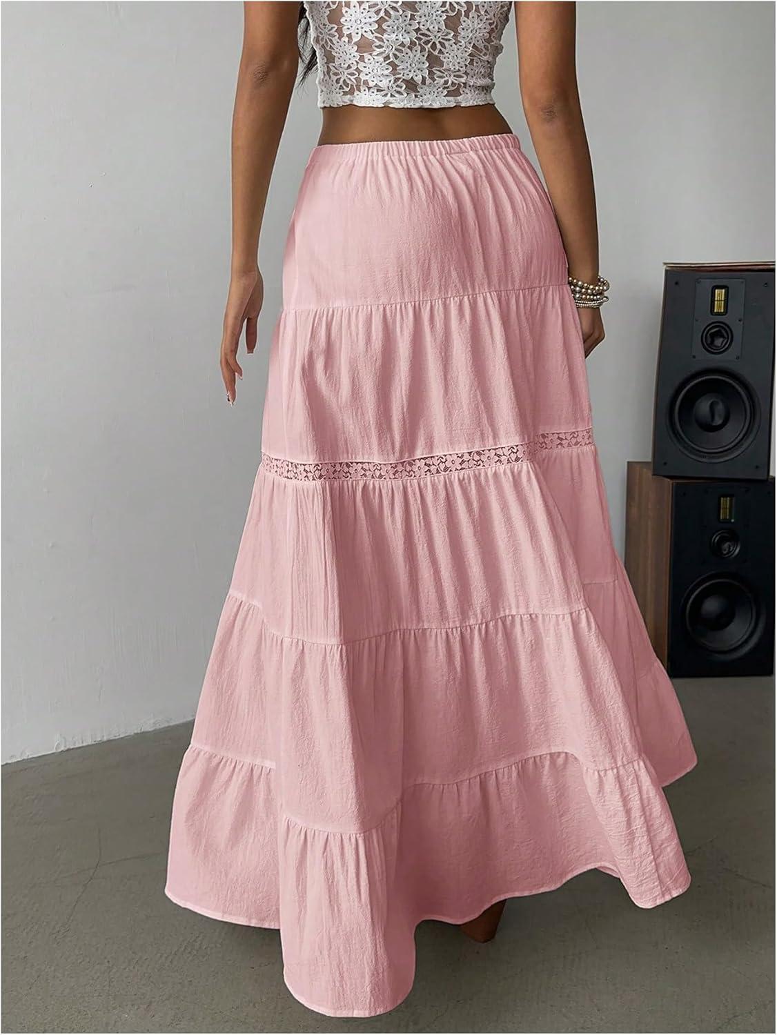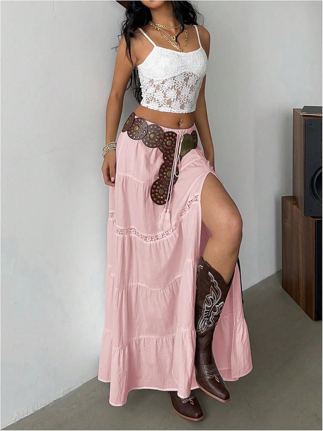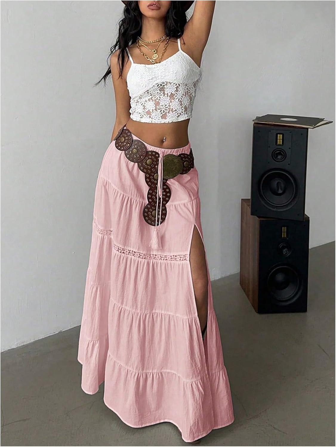 SOLY HUX Women’s Summer Split Maxi Skirt Tie Front Elastic Waist Lace Ruffle Hem Long Flowy Skirts(Pure Pink)