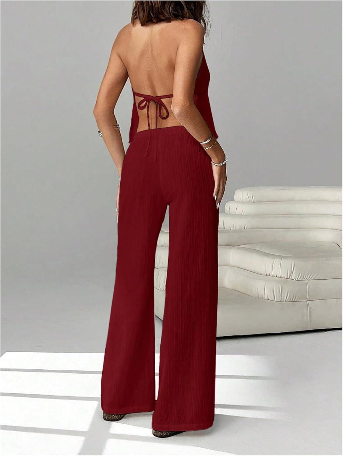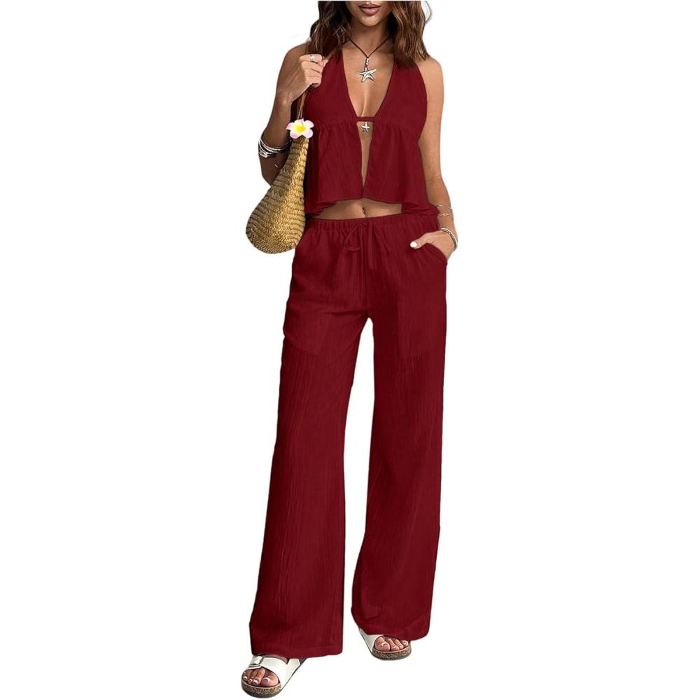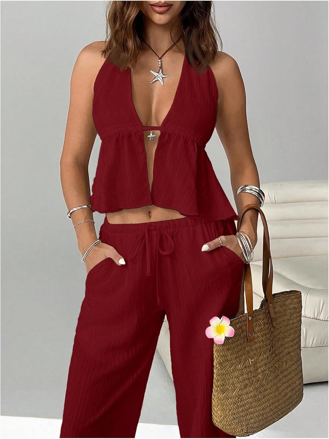 SOLY HUX Women’s Summer Vacation 2 Piece Outfits Sexy Deep V Neck Halter Tops and Pants Sets(Pure Burgundy)