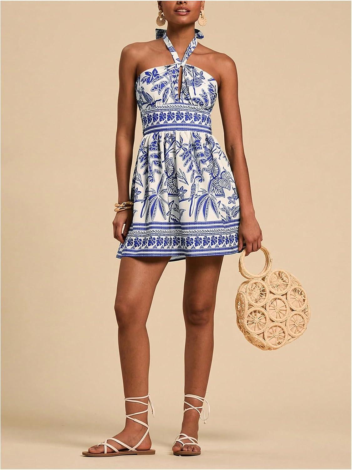 SOLY HUX Women’s Sundress Tropical Print Halter Dress Tie Backless Sleeveless A Line Short Summer Dresses(Blue Leaf)