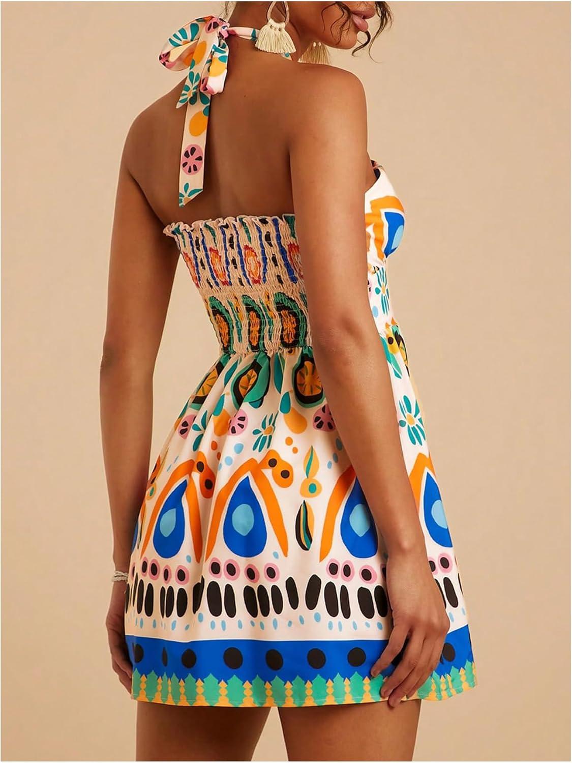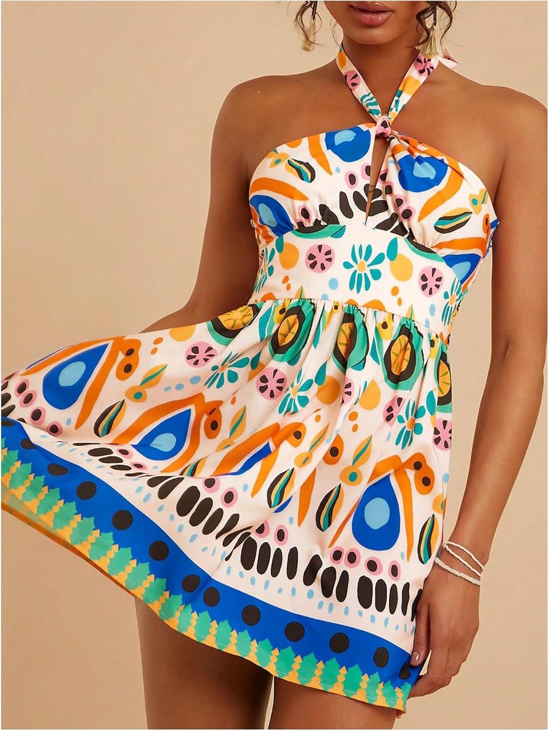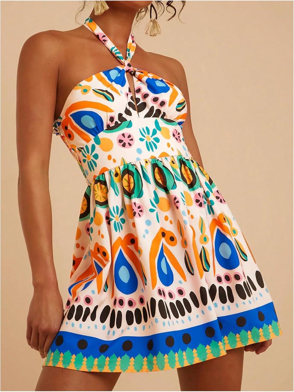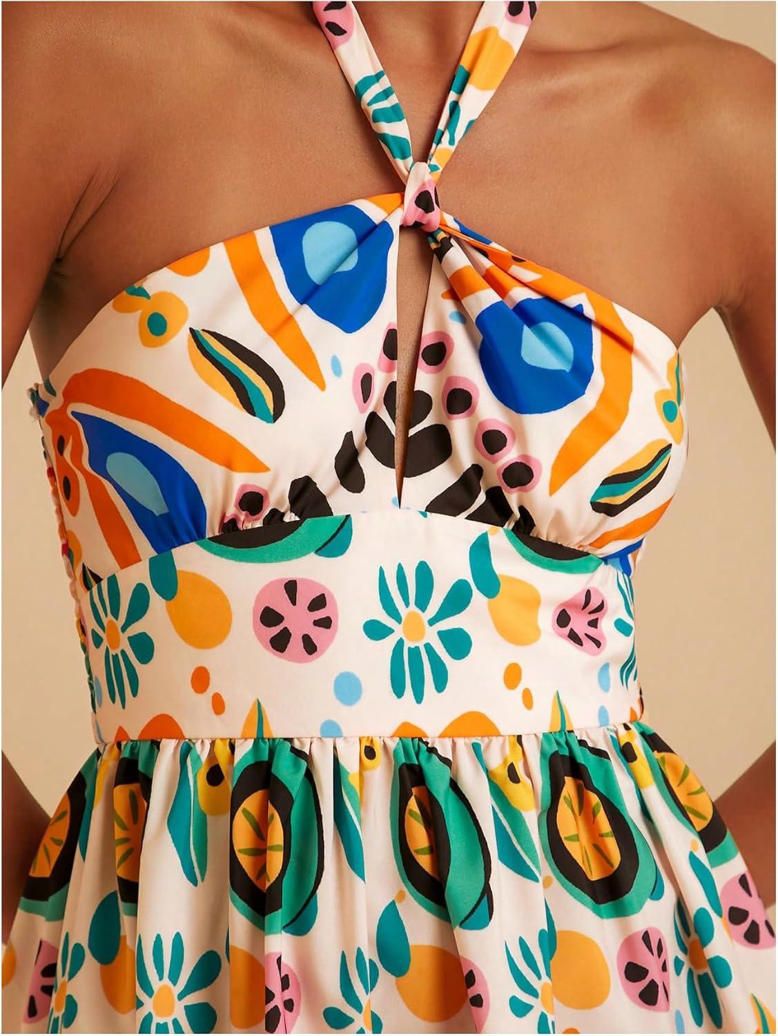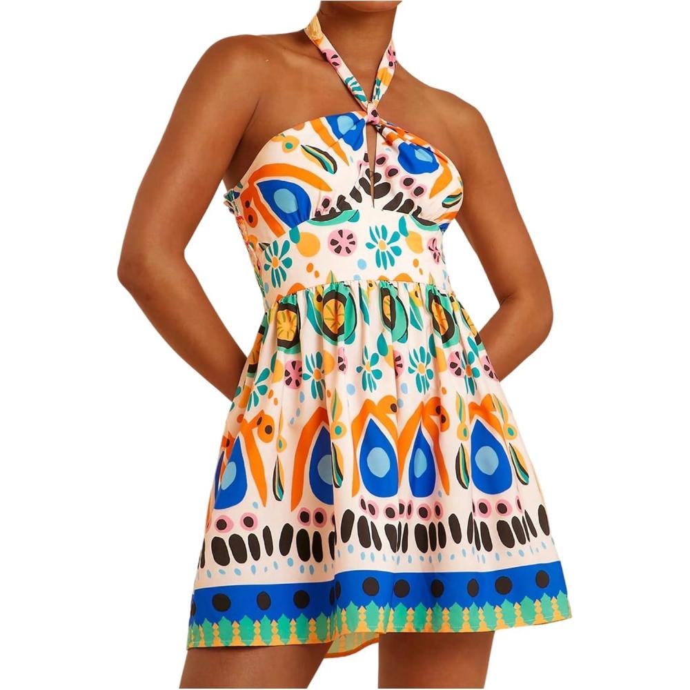 SOLY HUX Women’s Sundress Tropical Print Halter Dress Tie Backless Sleeveless A Line Short Summer Dresses(Multicoloured Printed)