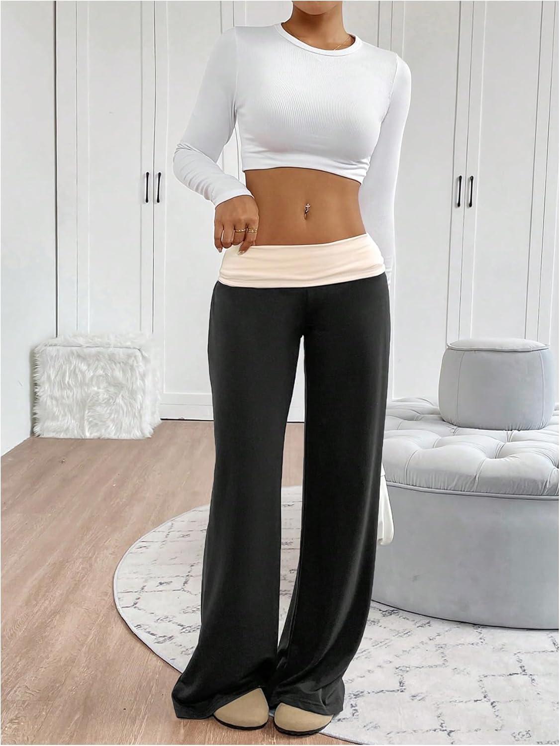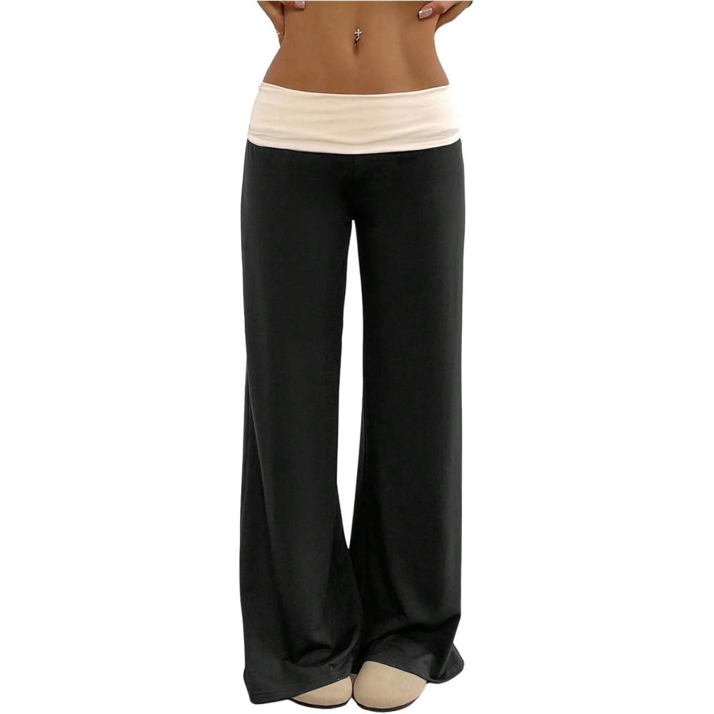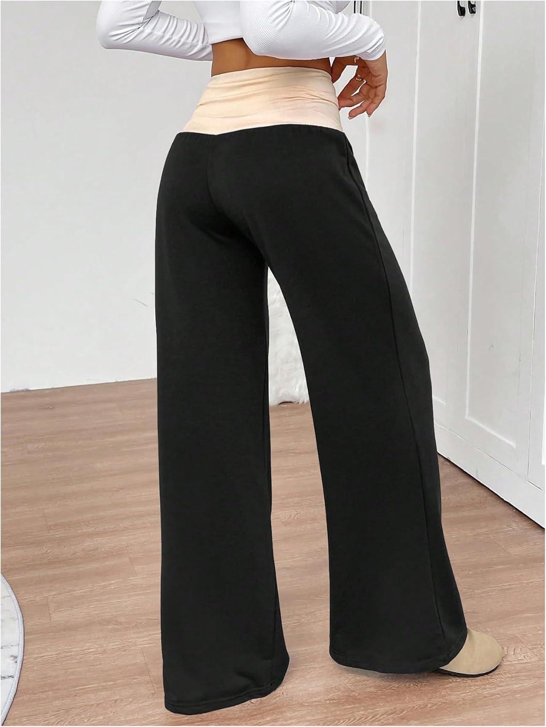 SOLY HUX Women’s Sweatpants Color Block Low Rise Fold Over Waist Baggy Wide Leg Pants(Black and Beige)