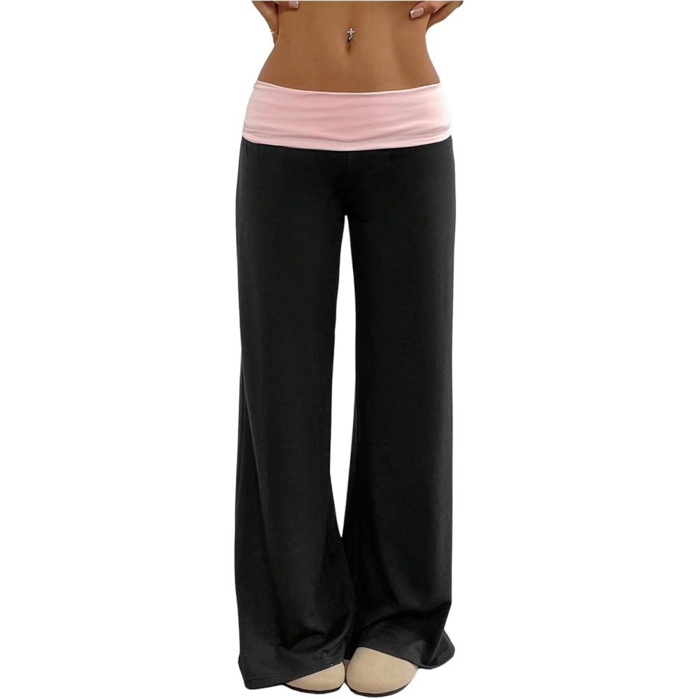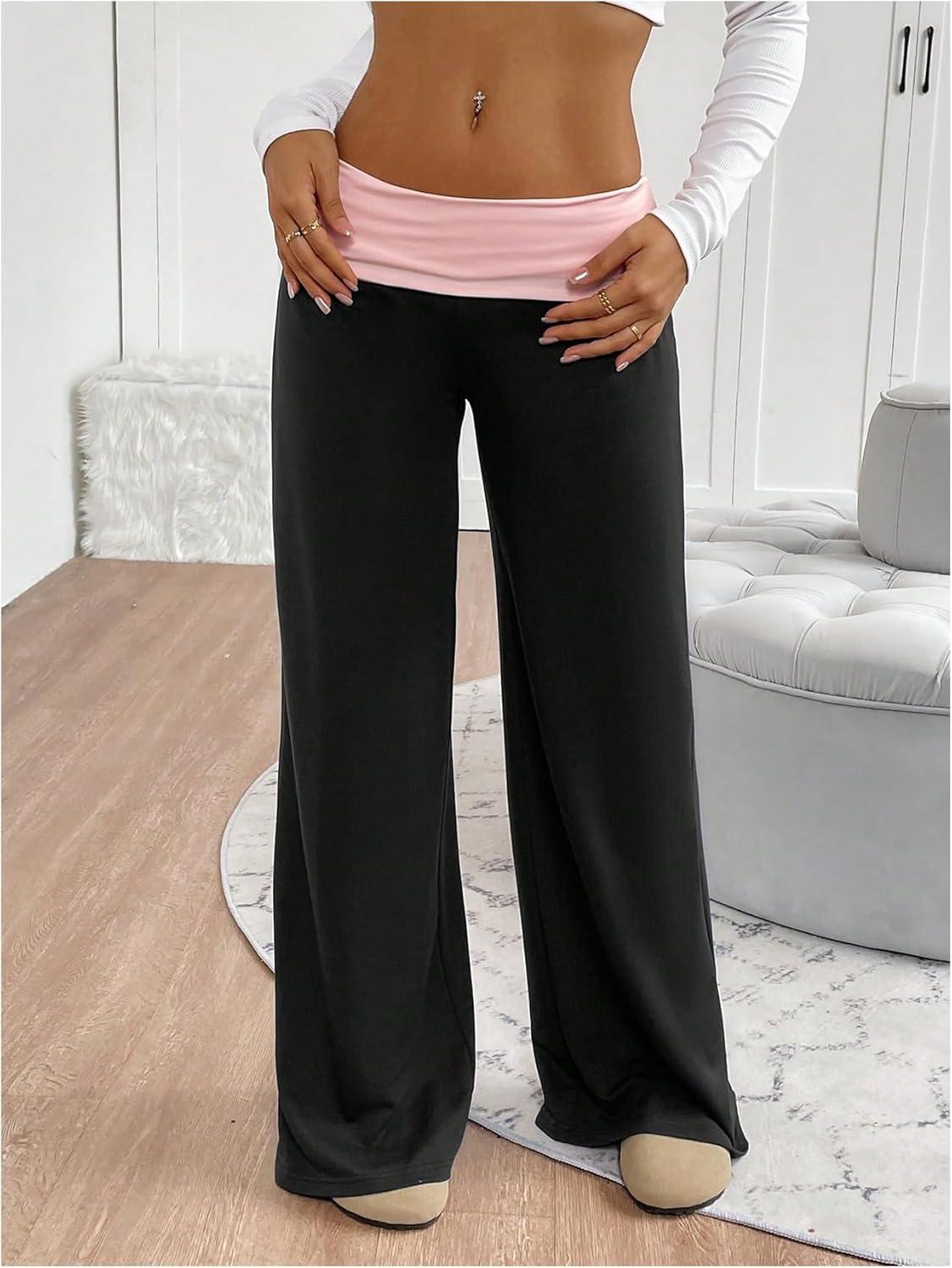 SOLY HUX Women’s Sweatpants Color Block Low Rise Fold Over Waist Baggy Wide Leg Pants(Black and Pink)