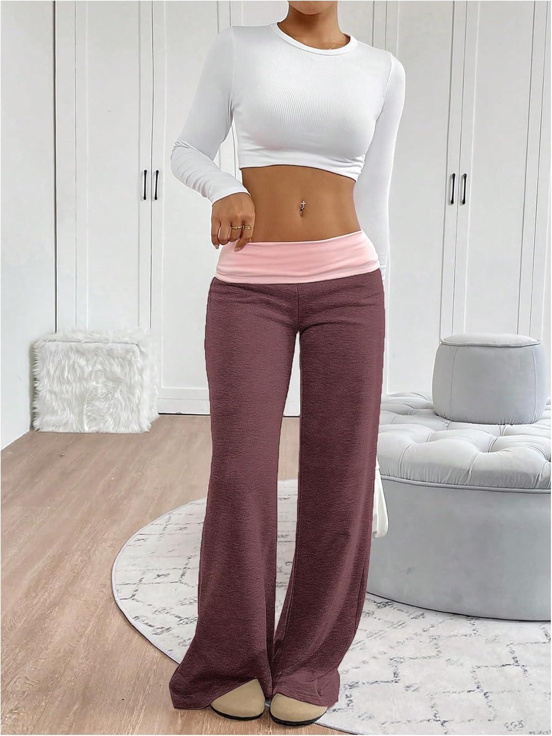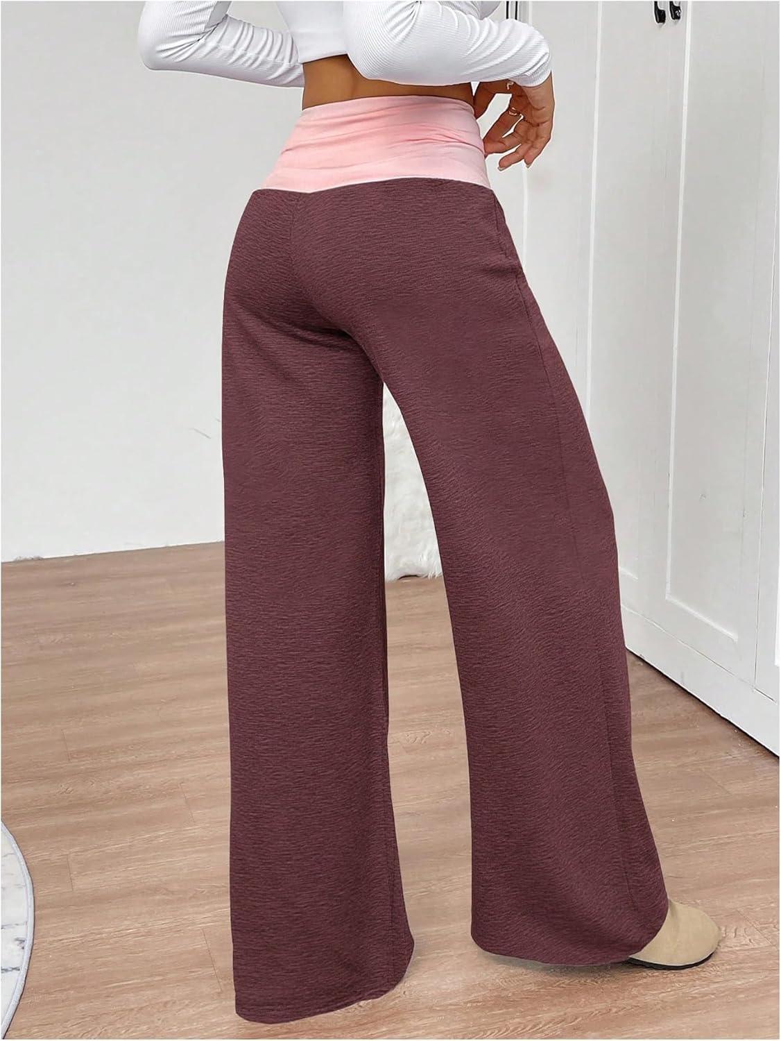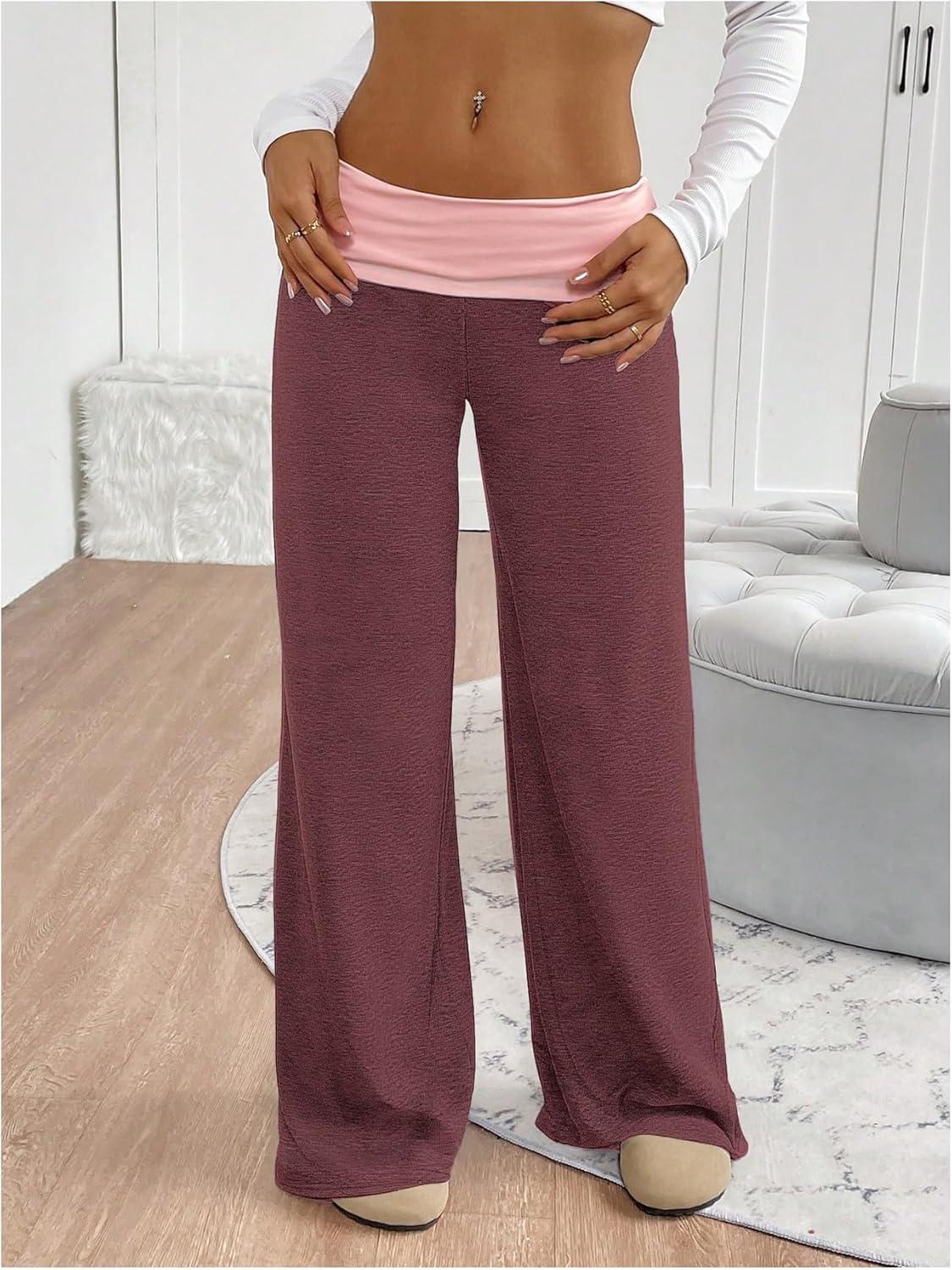 SOLY HUX Women’s Sweatpants Color Block Low Rise Fold Over Waist Baggy Wide Leg Pants(Brown and Pink)