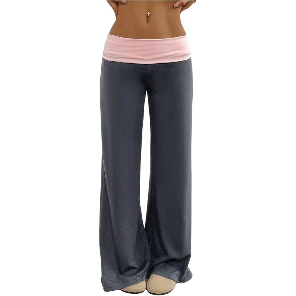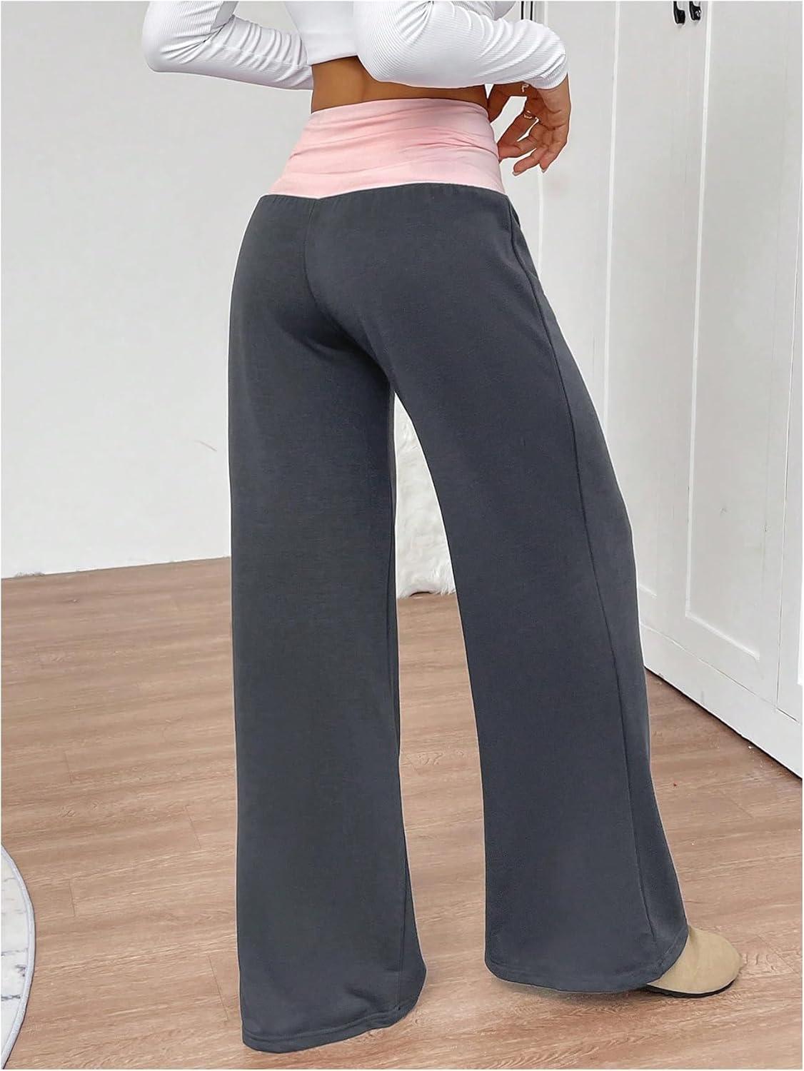 SOLY HUX Women’s Sweatpants Color Block Low Rise Fold Over Waist Baggy Wide Leg Pants(Dark Grey and Pink)