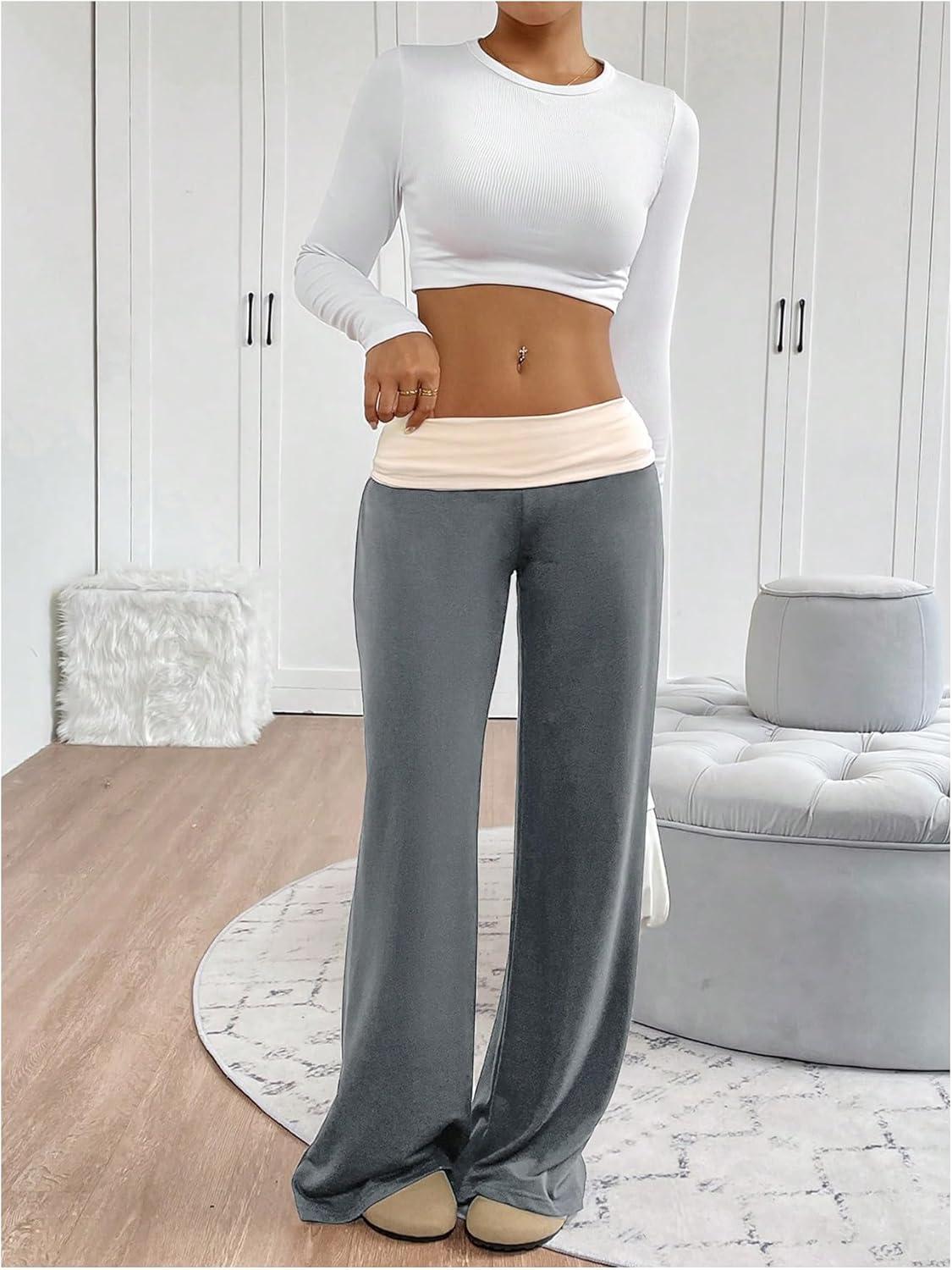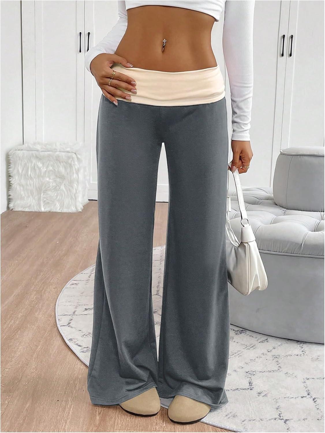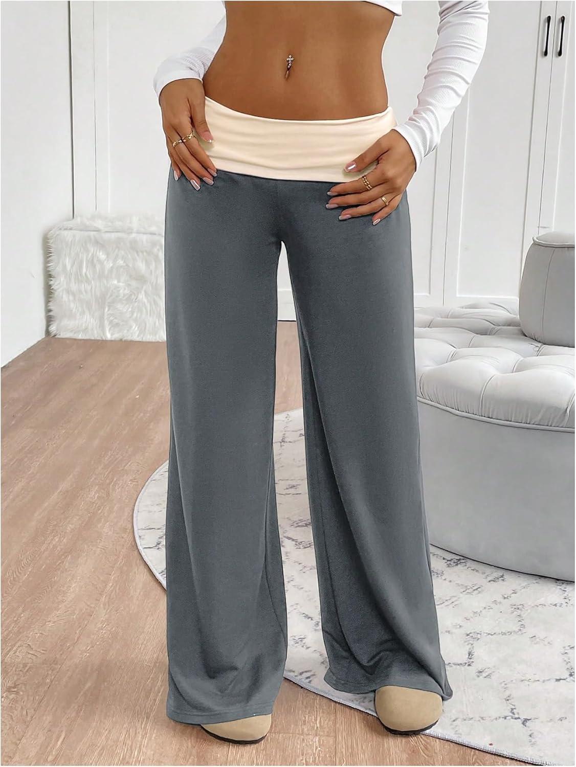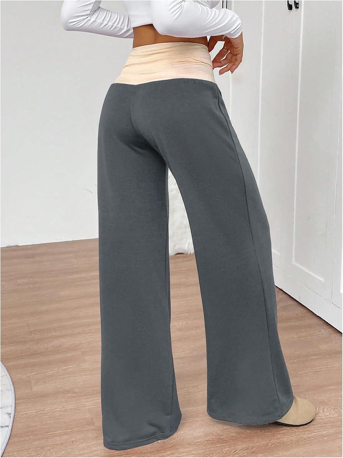 SOLY HUX Women’s Sweatpants Color Block Low Rise Fold Over Waist Baggy Wide Leg Pants(Grey and Beige)