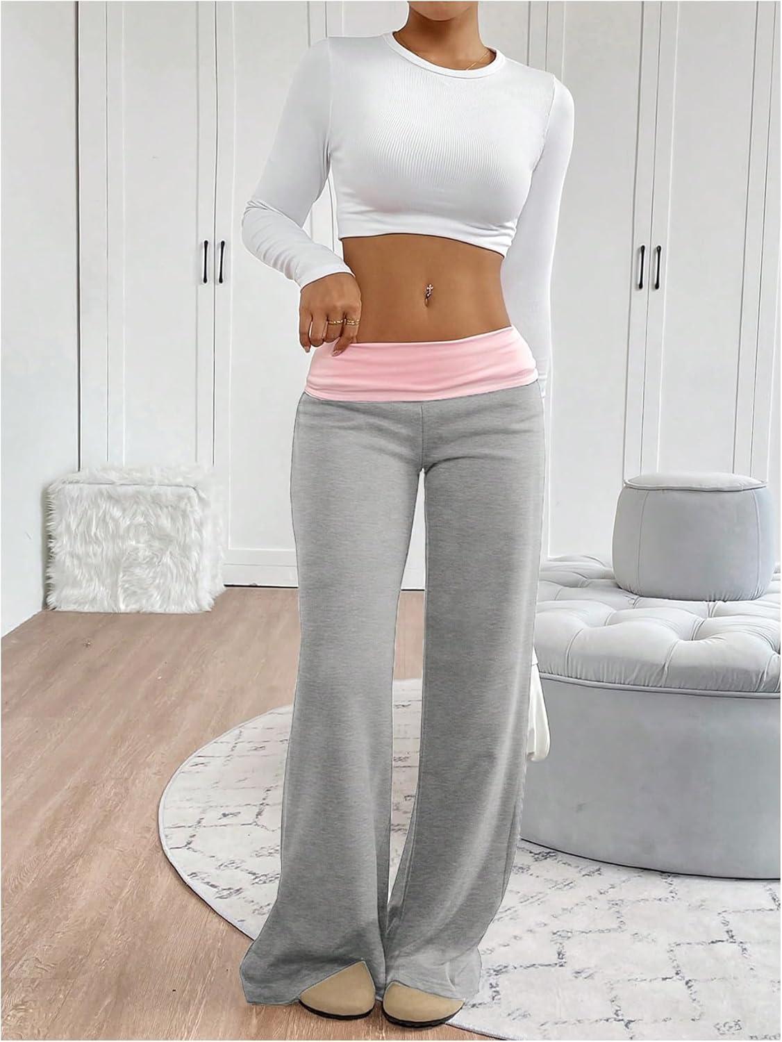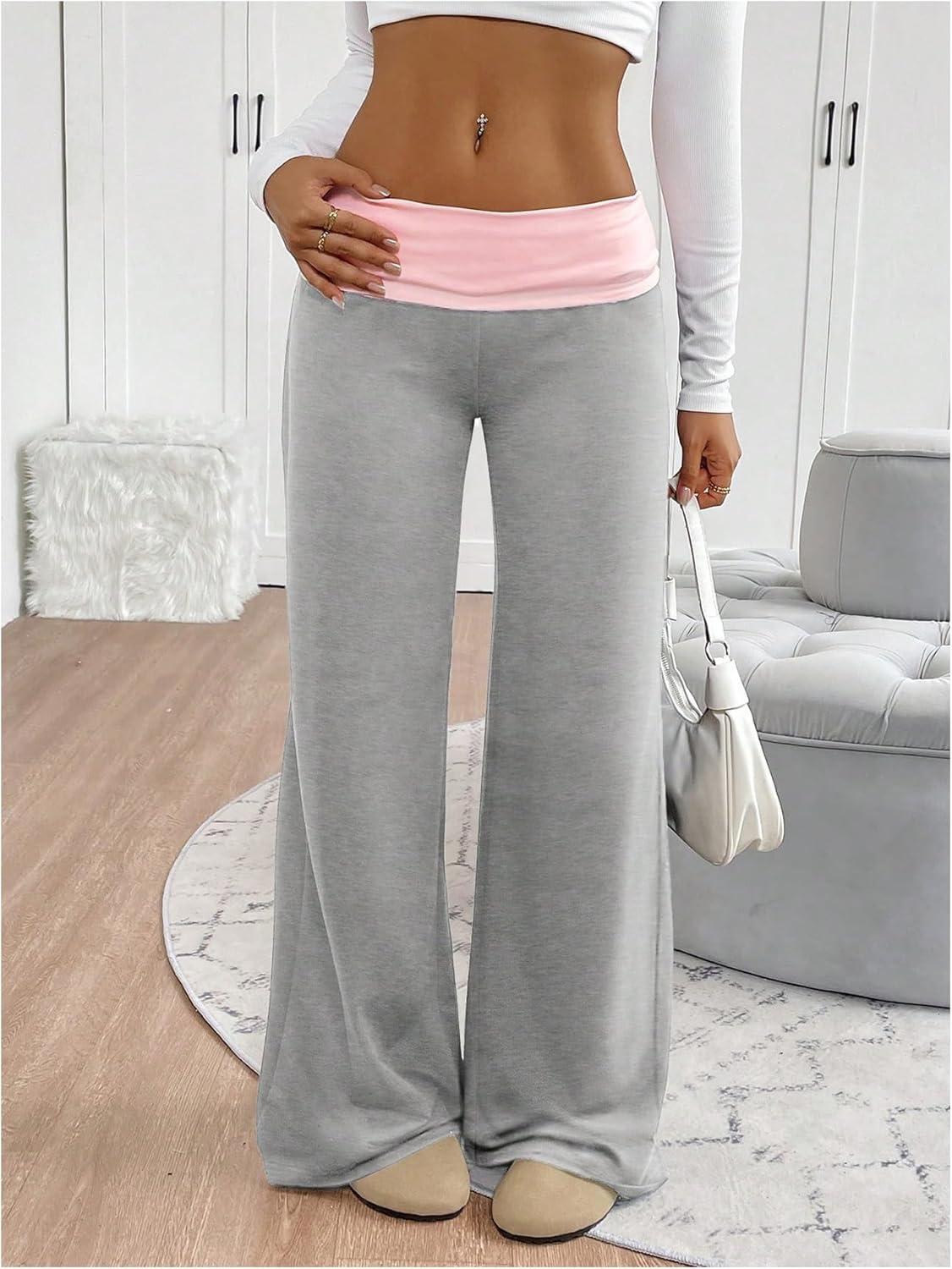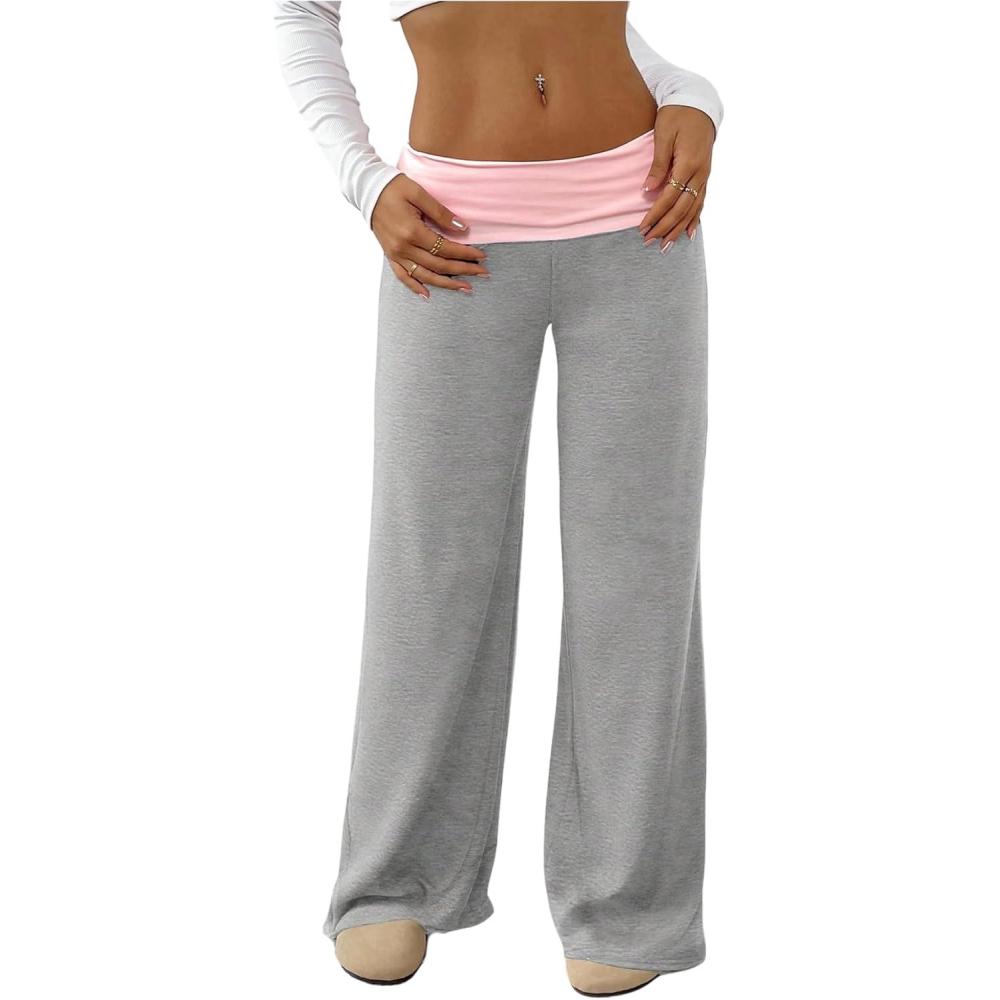 SOLY HUX Women’s Sweatpants Color Block Low Rise Fold Over Waist Baggy Wide Leg Pants(Light Grey and Pink)