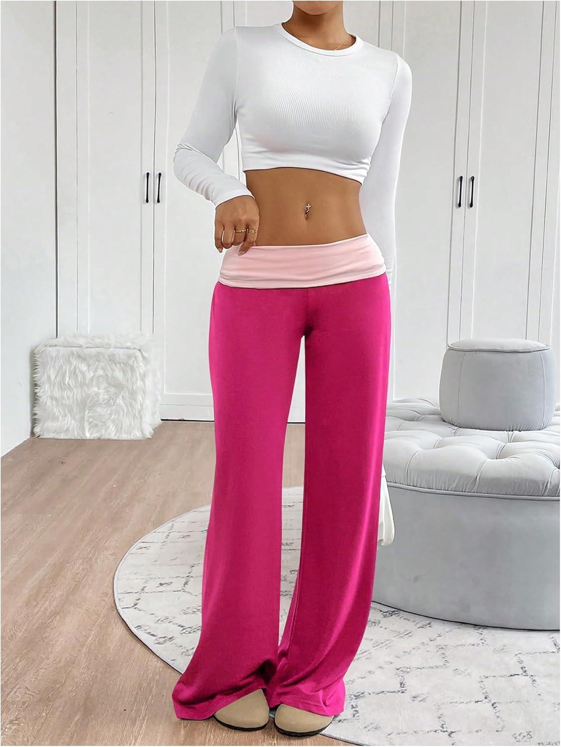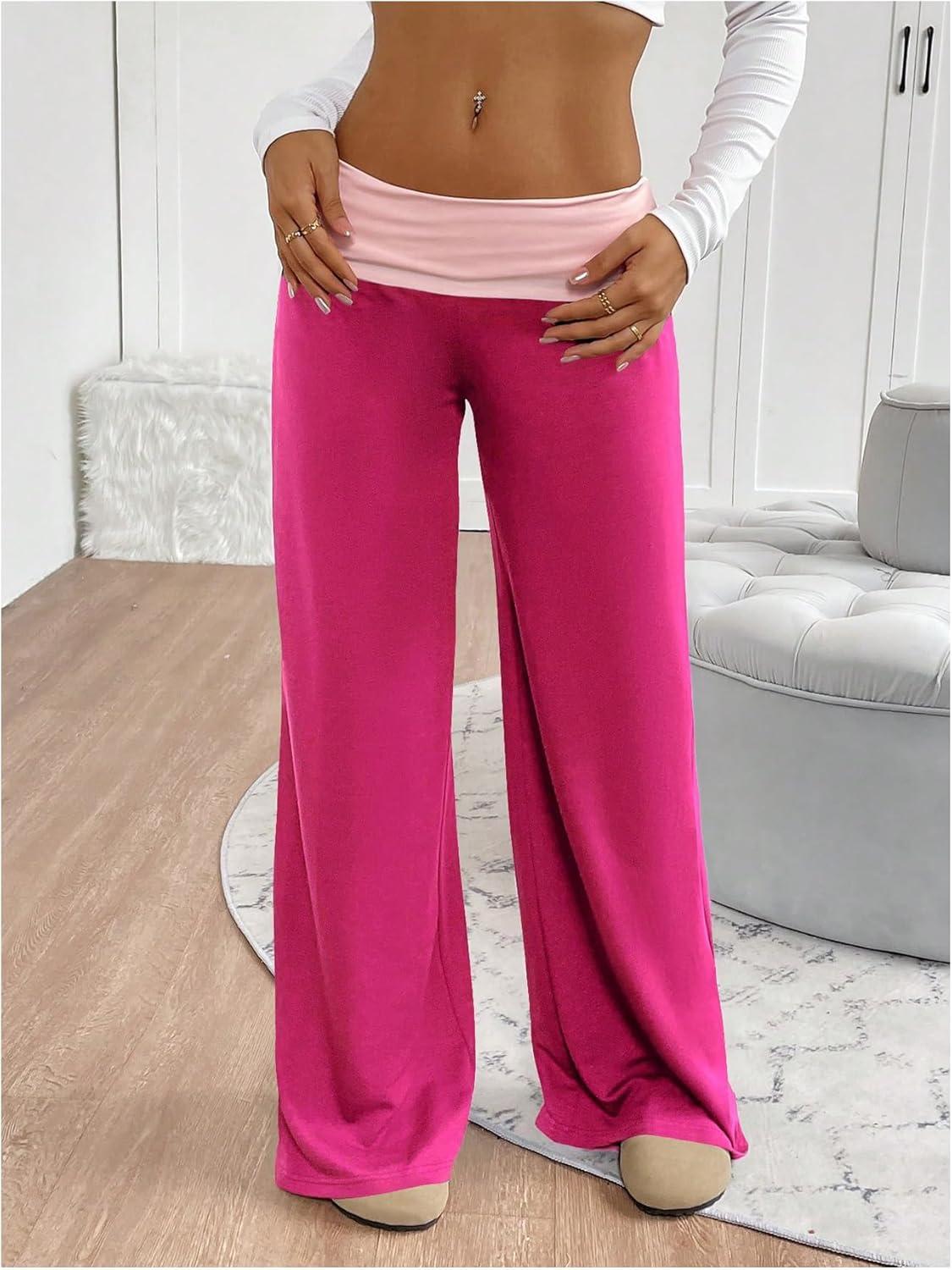 SOLY HUX Women’s Sweatpants Color Block Low Rise Fold Over Waist Baggy Wide Leg Pants(Plain Hotpink)