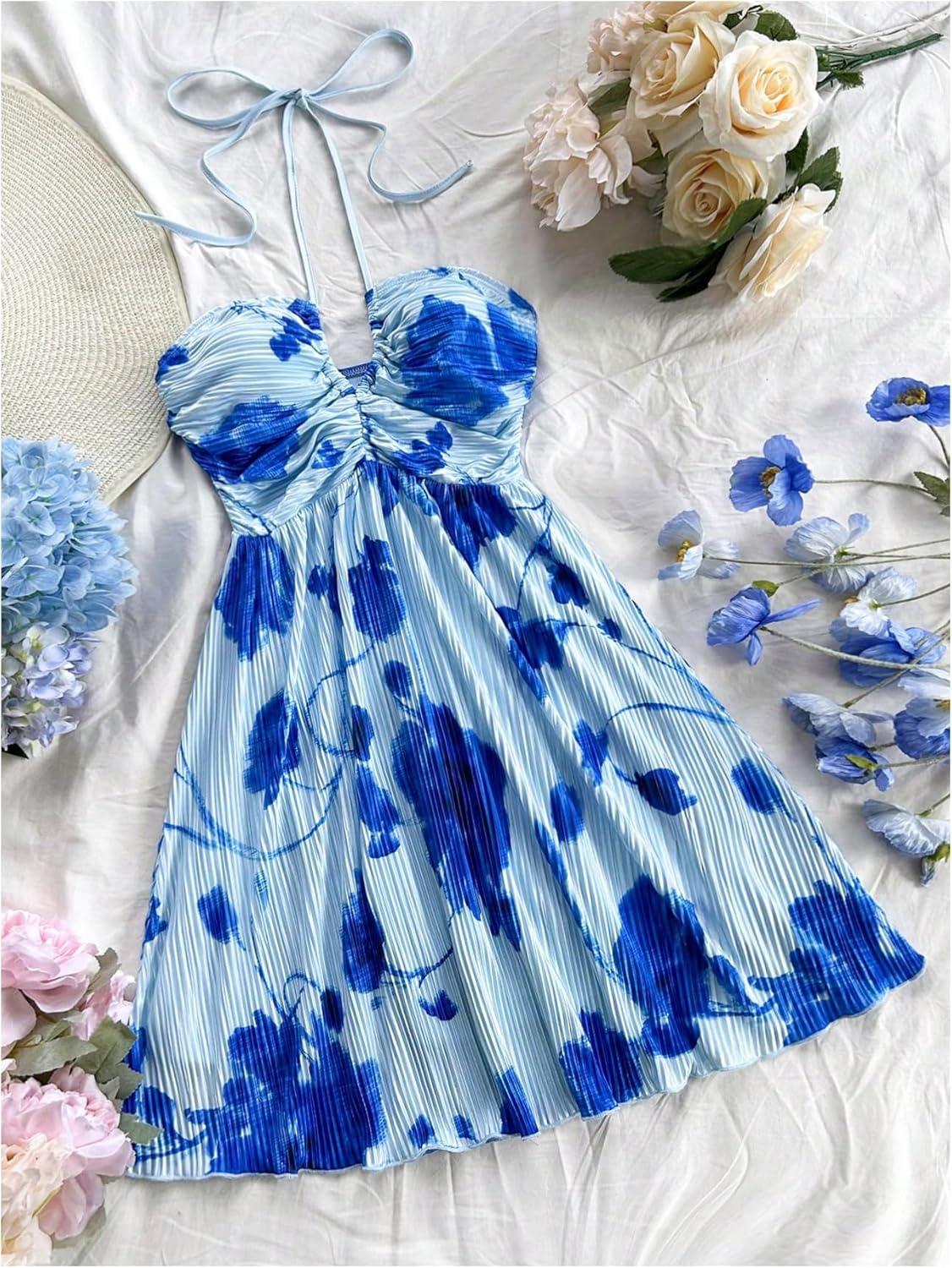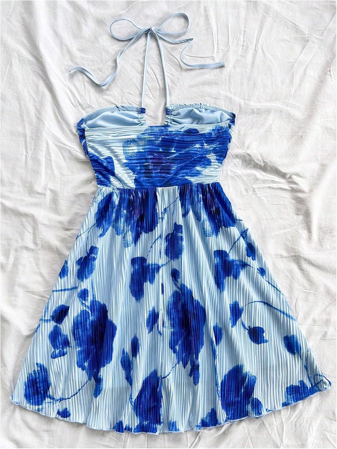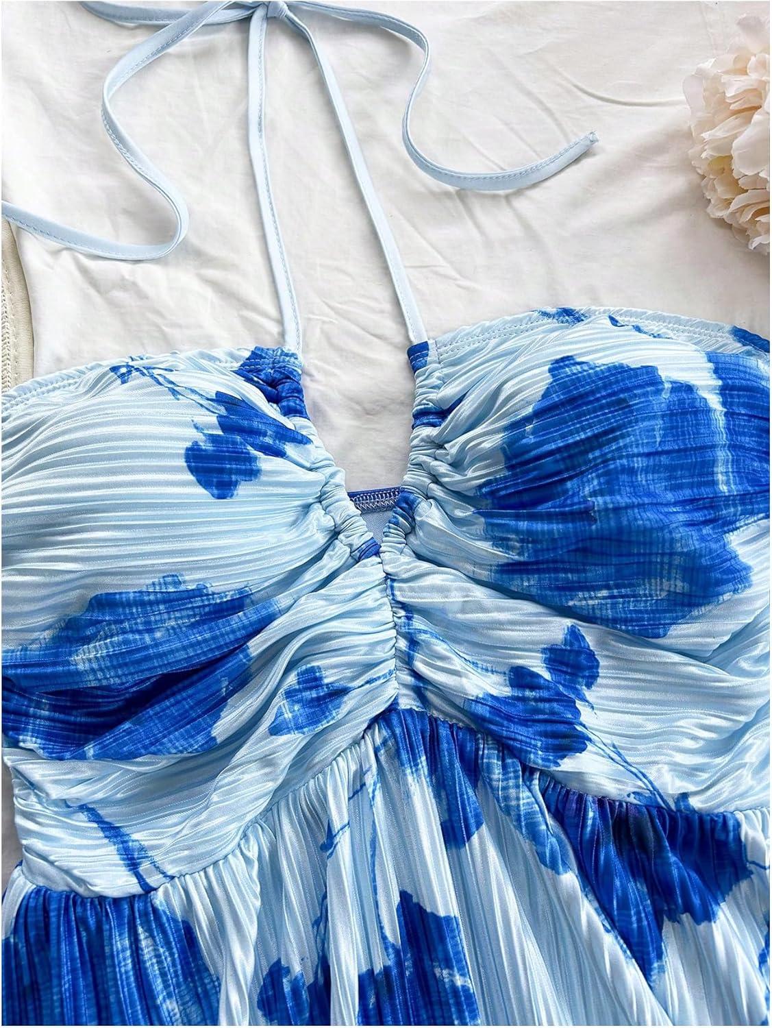 SOLY HUX Women’s Tie Dye Cami Dress Halter Backless Sleeveless A Line Short Summer Dresses Sundress(Blue Floral)