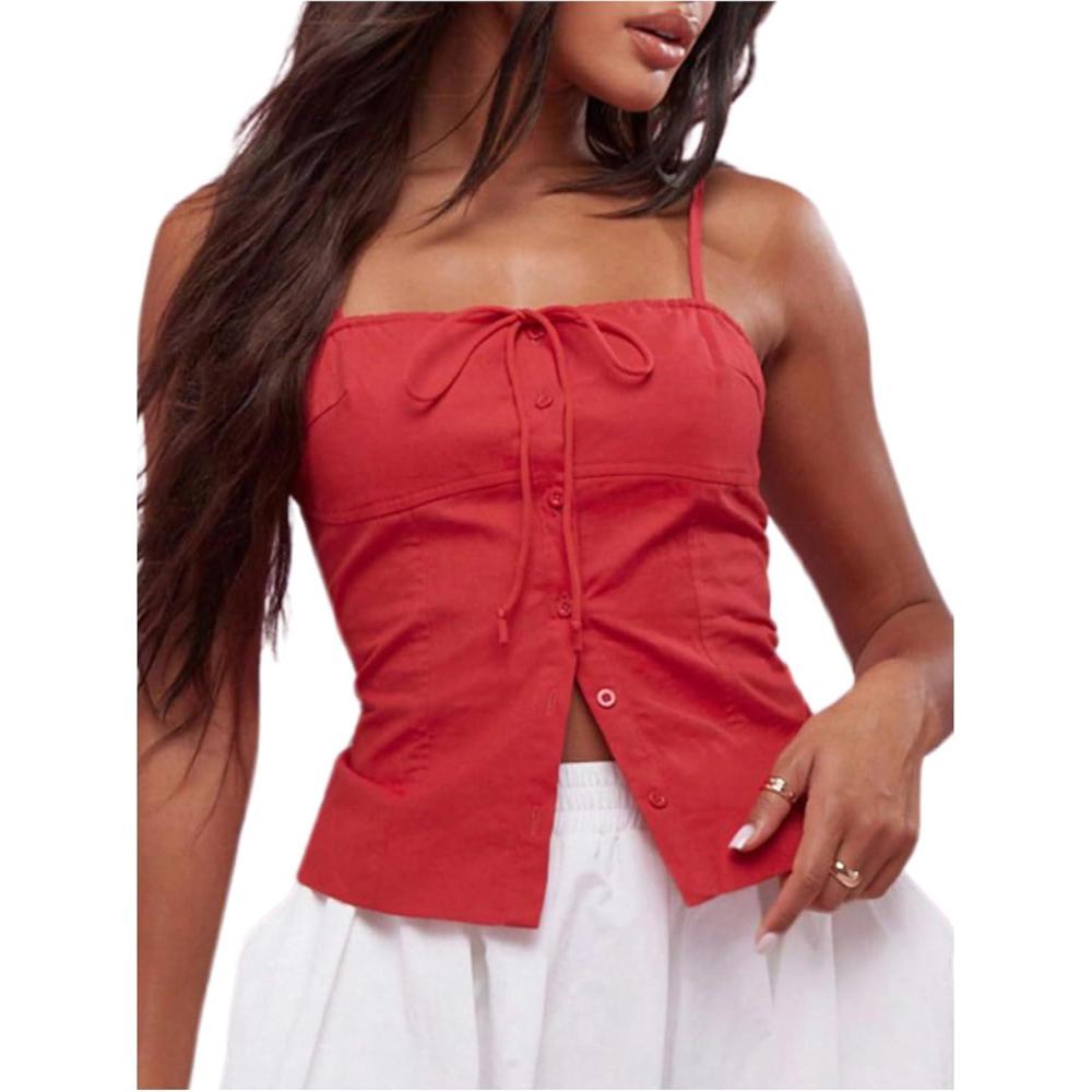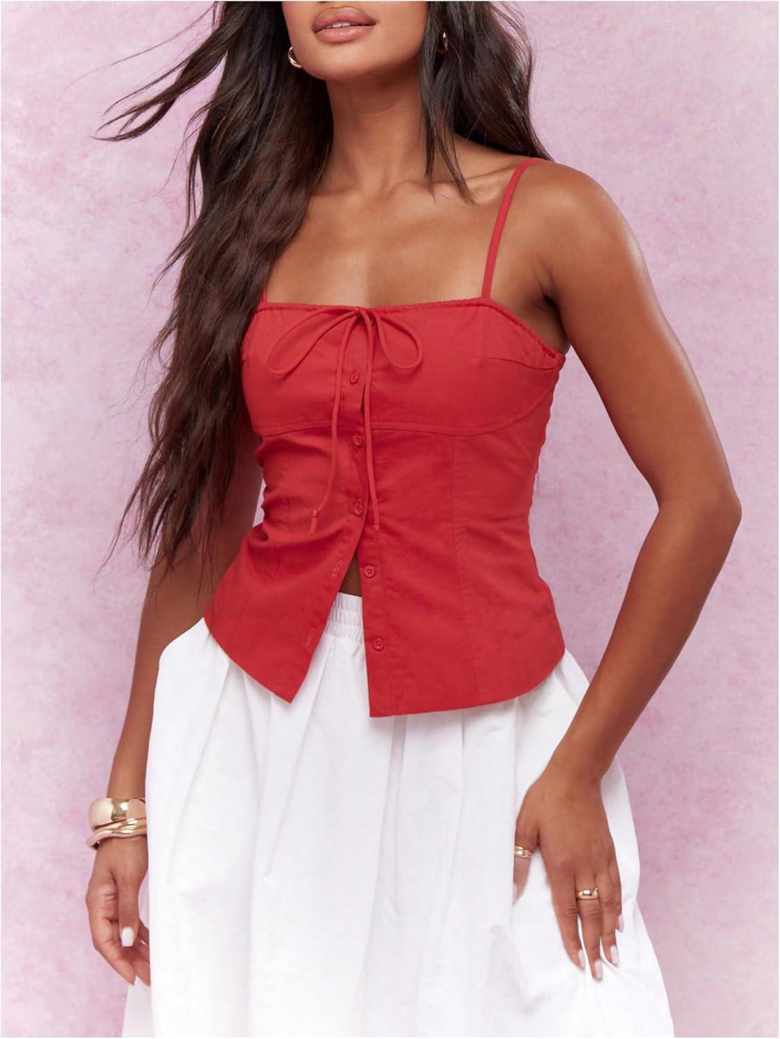 SOLY HUX Women’s Tie Front Button Down Cami Top Y2k Spaghetti Strap Bustier Corset Tops Camisole(Solid Red)