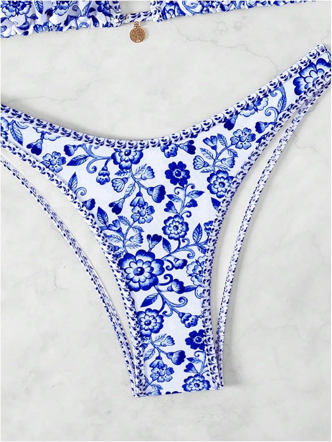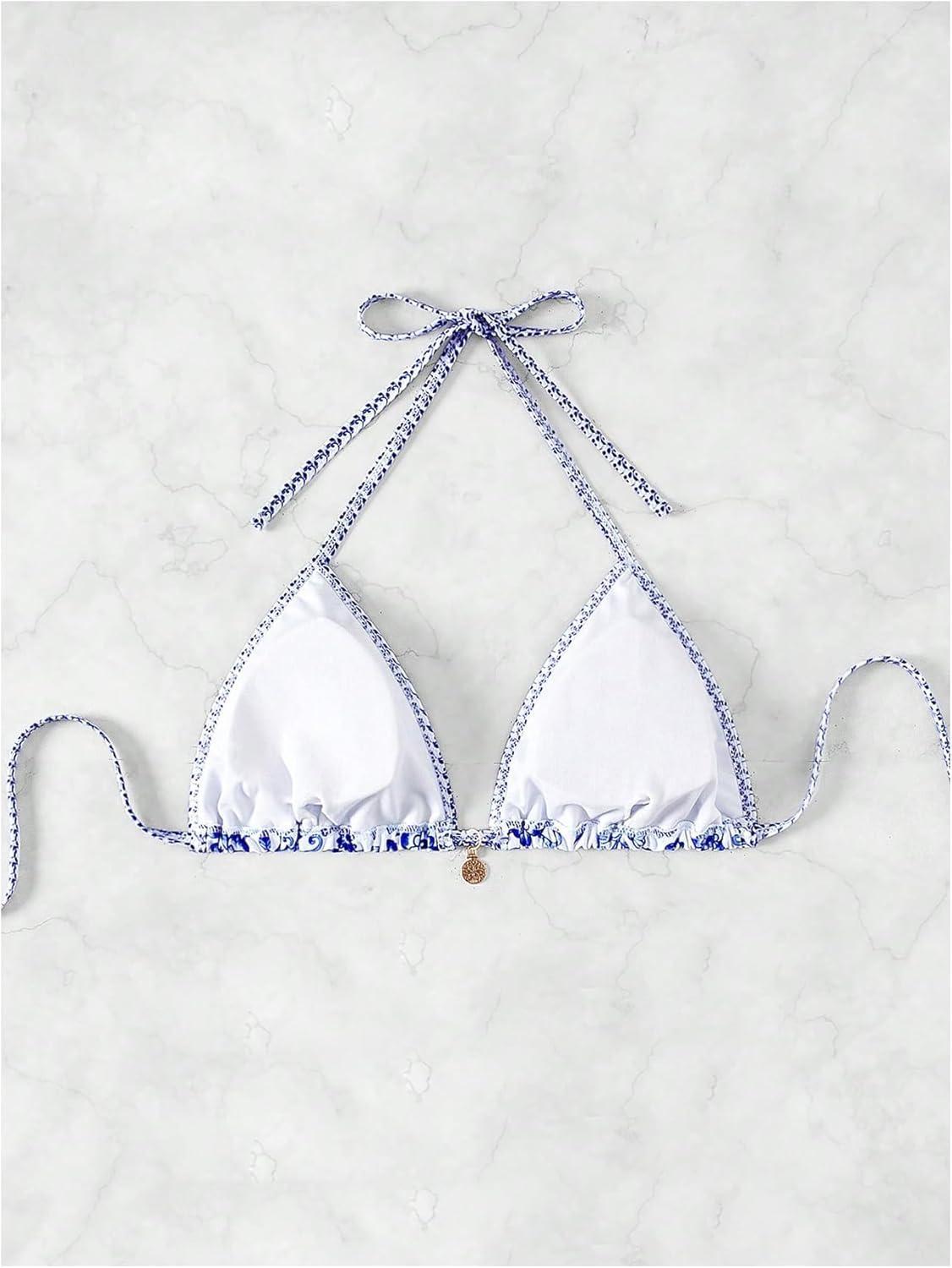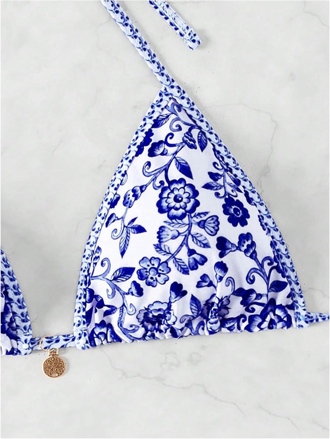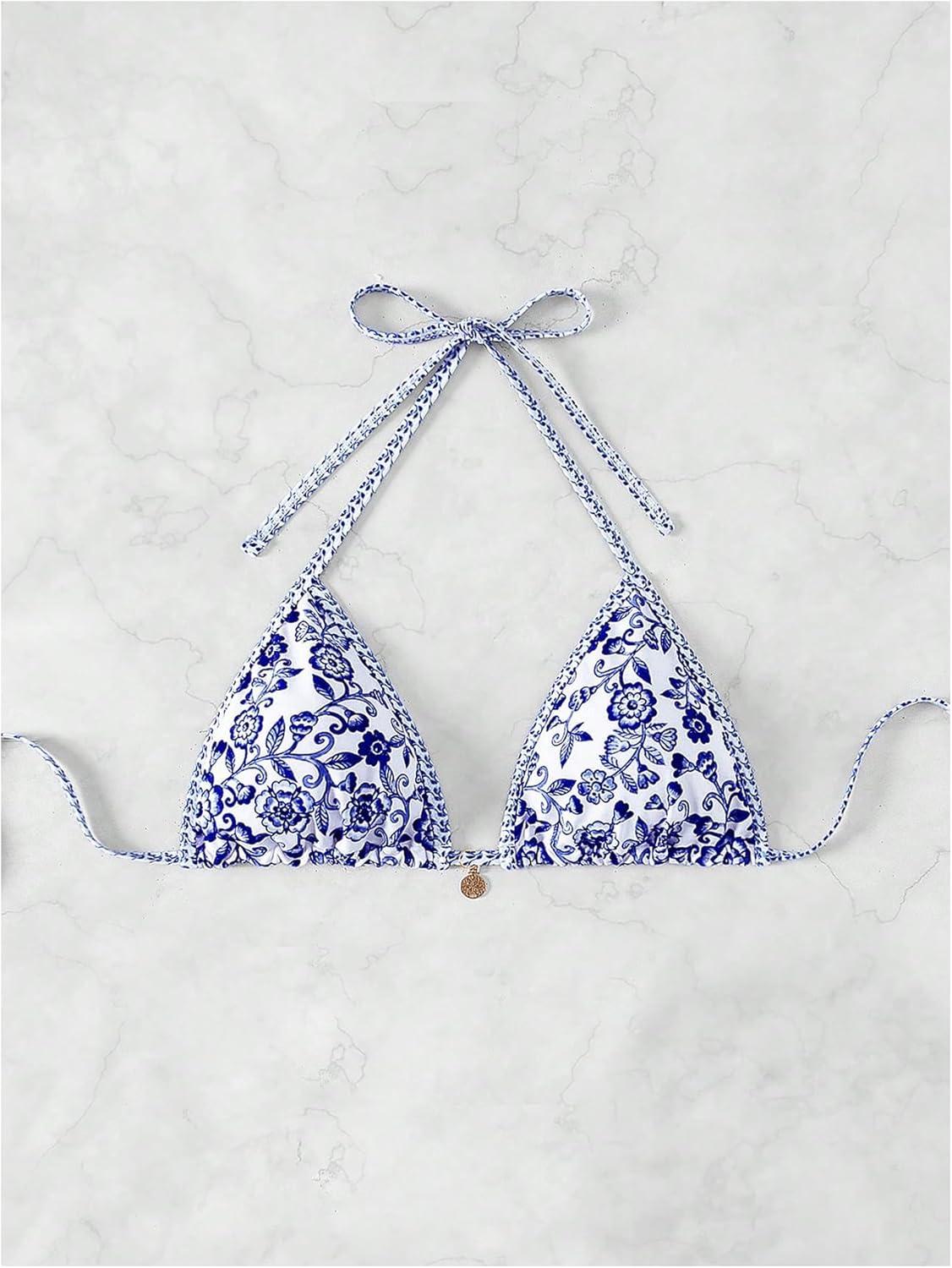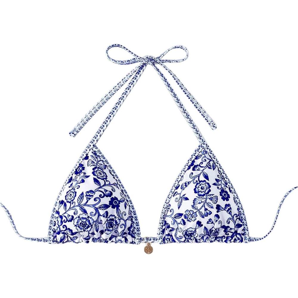 SOLY HUX Women’s Triangle Bikini Top Only Tie Back String Floral Print Padded Swimwear Bathing Suits Tops(Blue Floral)