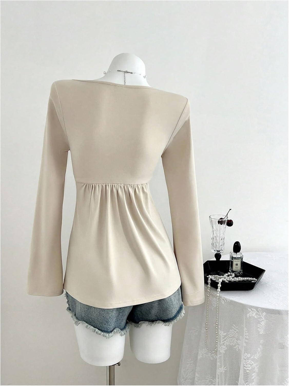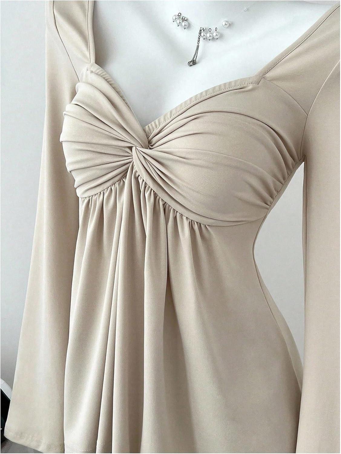 SOLY HUX Women’s Twist Front Peplum Tops Long Sleeve Sweetheart Neck Tee Ruffle Hem T Shirt(Plain Apricot)