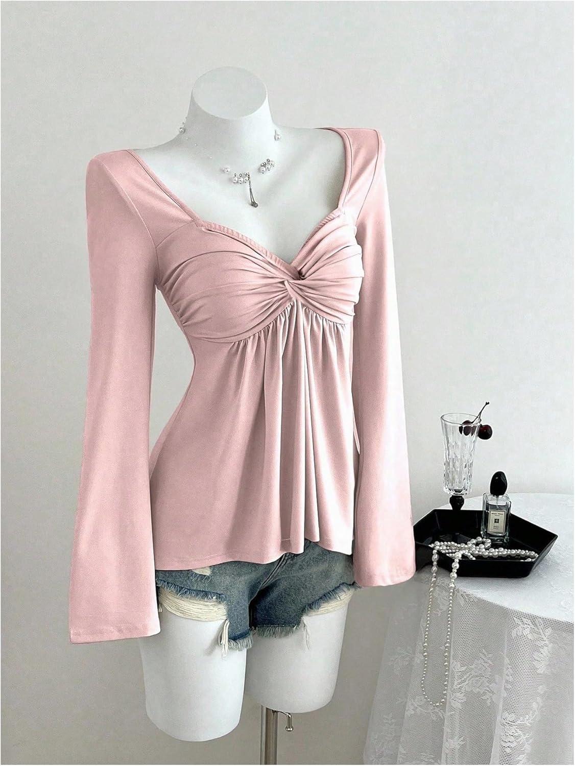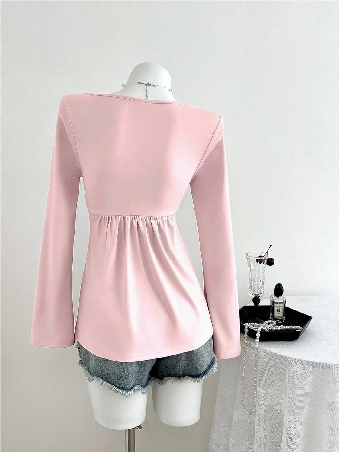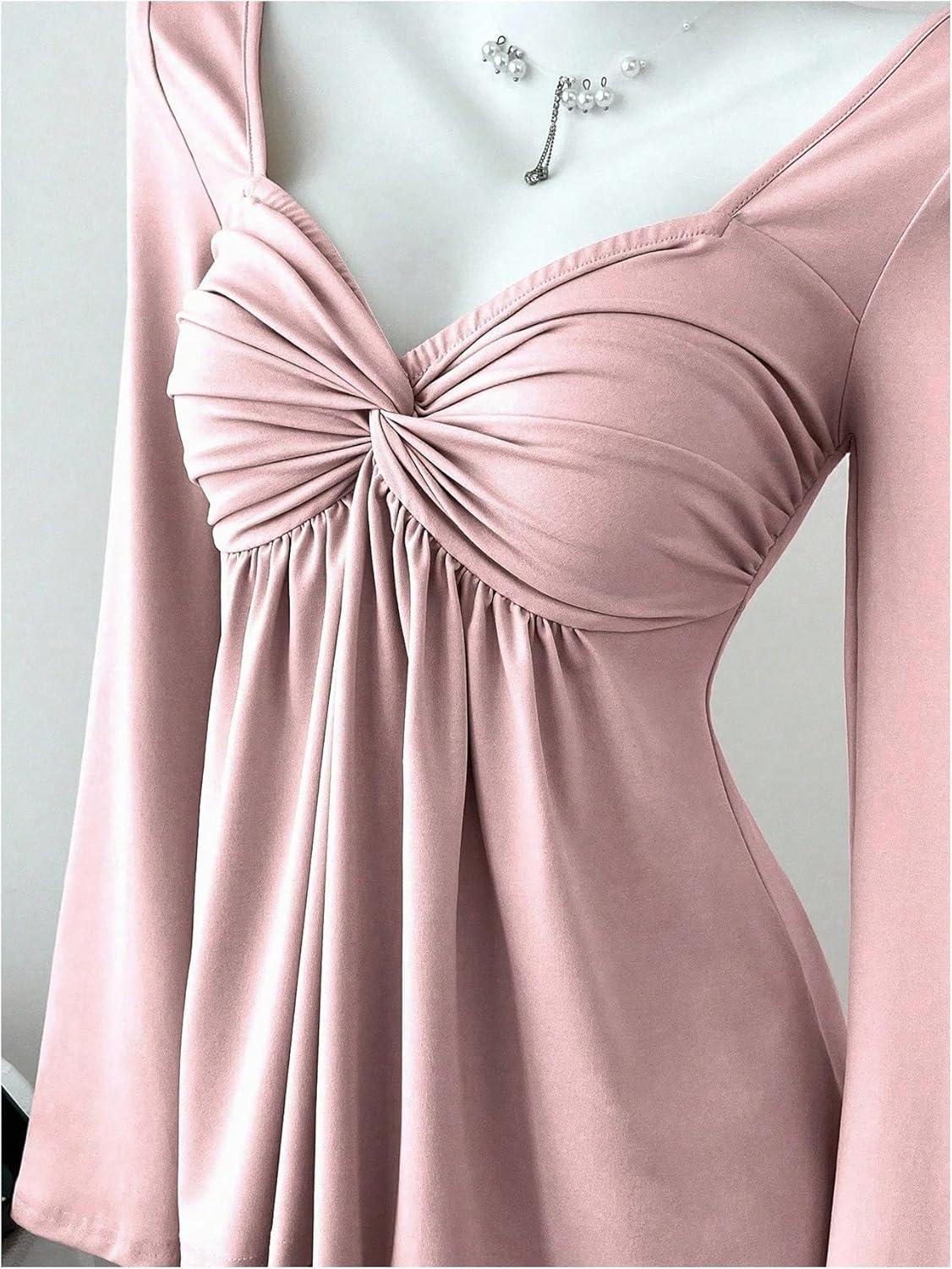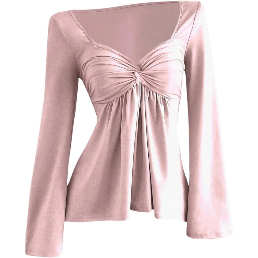 SOLY HUX Women’s Twist Front Peplum Tops Long Sleeve Sweetheart Neck Tee Ruffle Hem T Shirt(Pure Pink)
