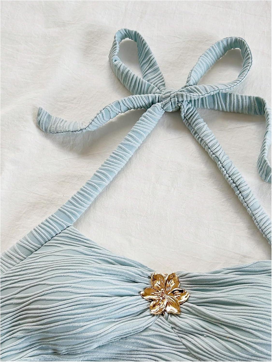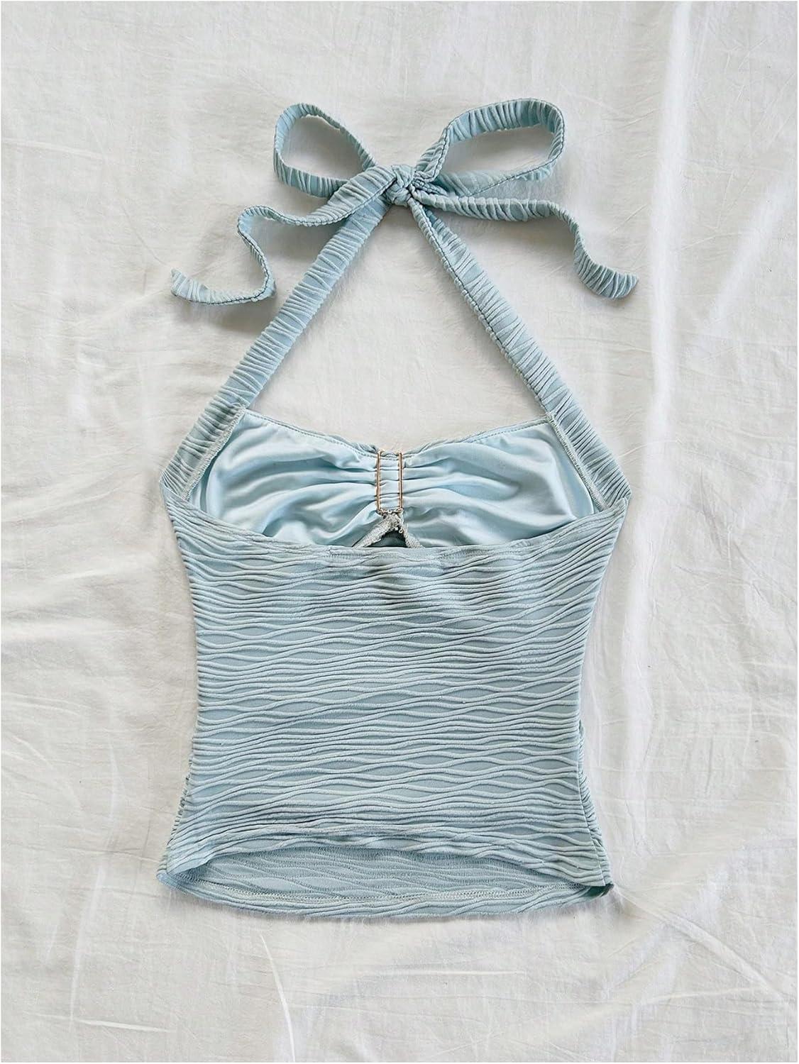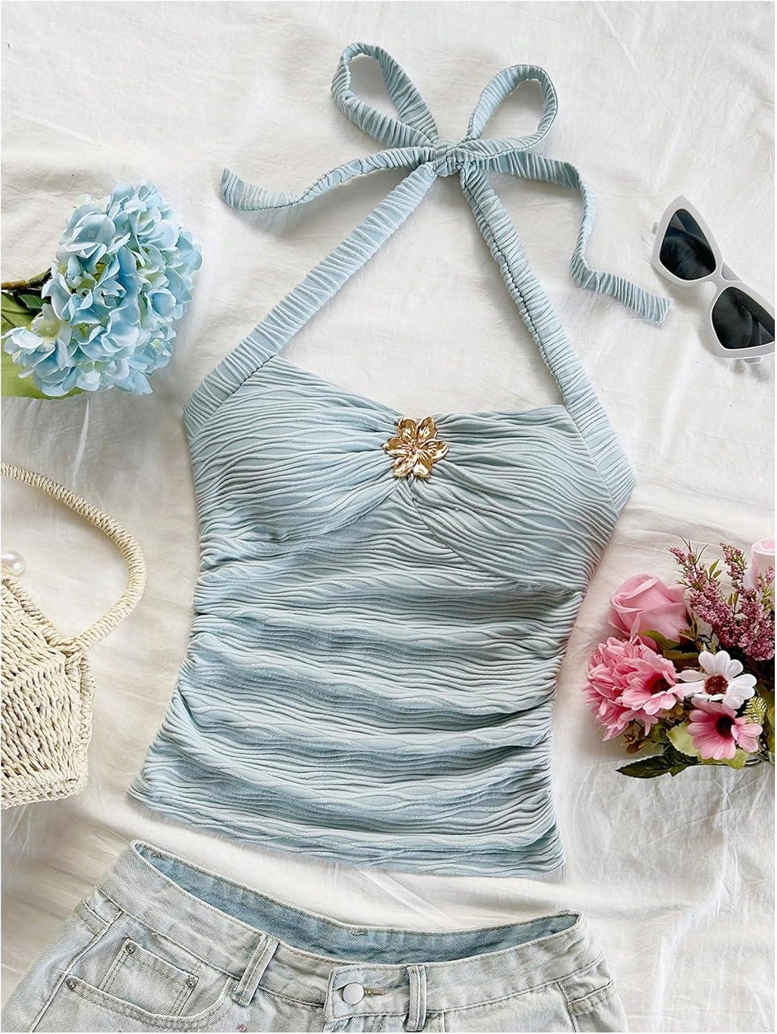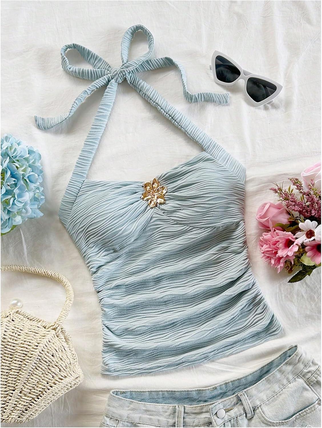 SOLY HUX Women’s V Neck Halter Tops Open Back Y2k Ruched Floral Metal Summer Going Out Cami Tops(Light Blue)