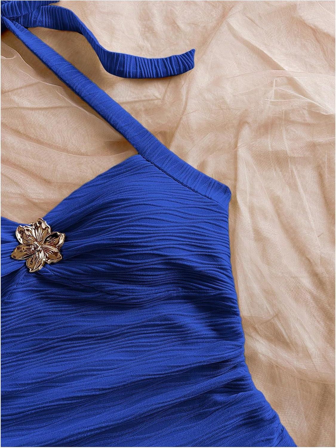 SOLY HUX Women’s V Neck Halter Tops Open Back Y2k Ruched Floral Metal Summer Going Out Cami Tops(Royal Blue)
