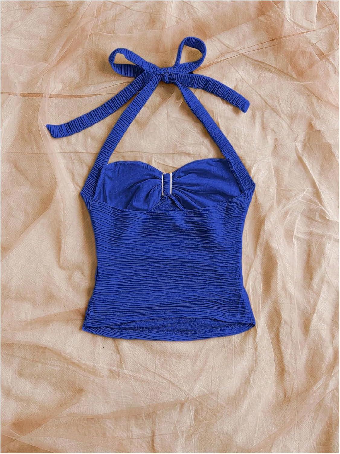 SOLY HUX Women’s V Neck Halter Tops Open Back Y2k Ruched Floral Metal Summer Going Out Cami Tops(Solid Blue)