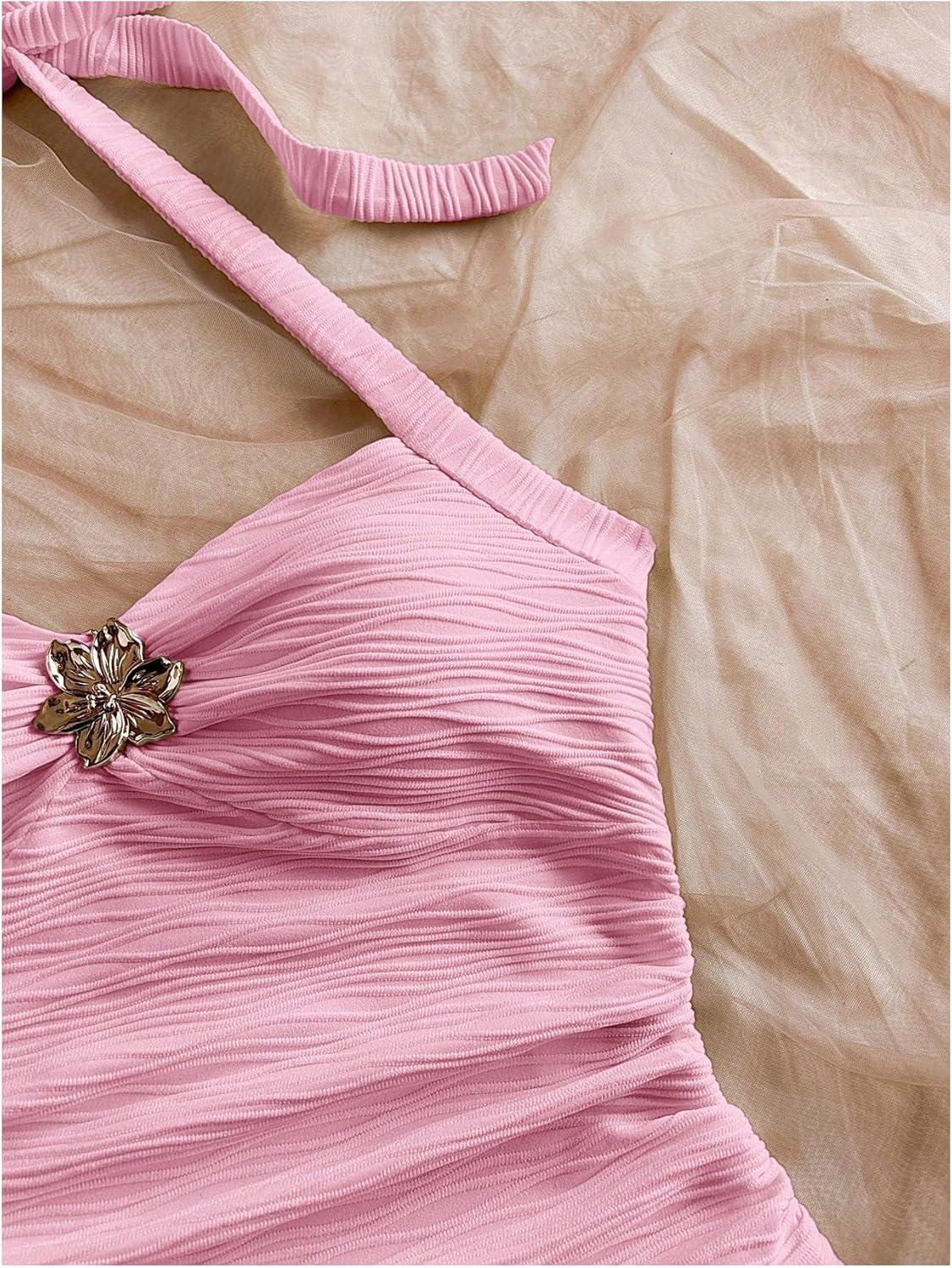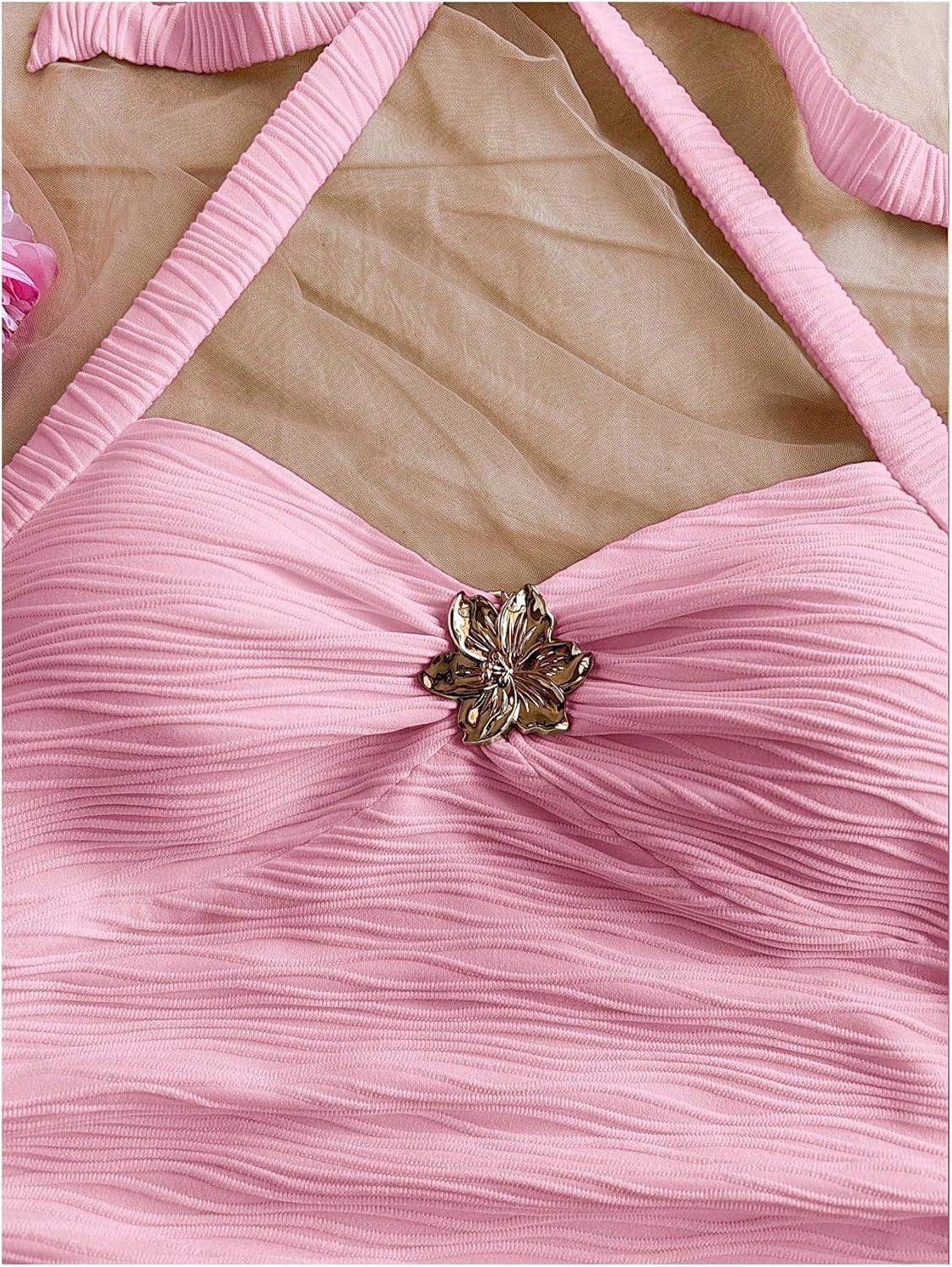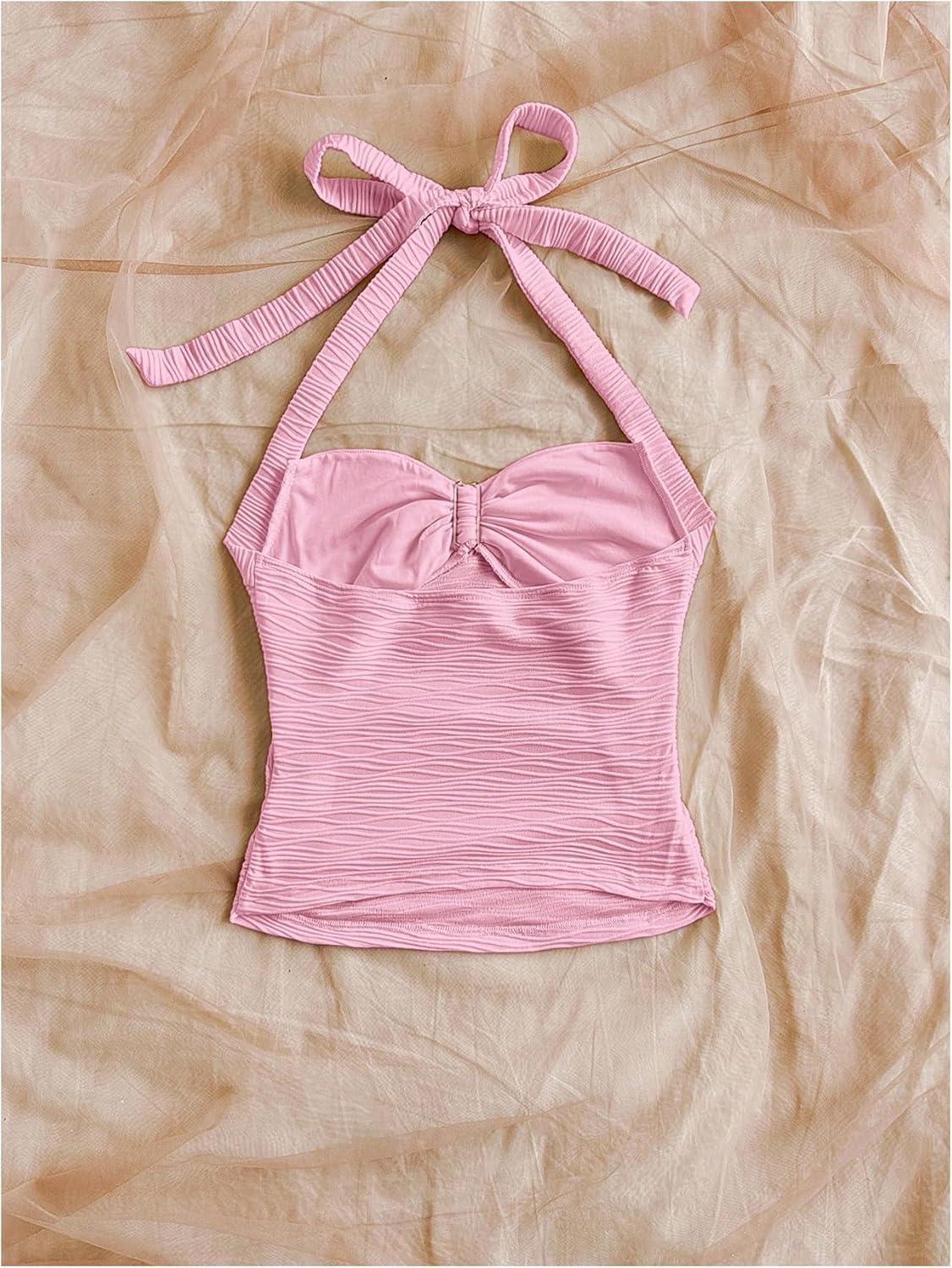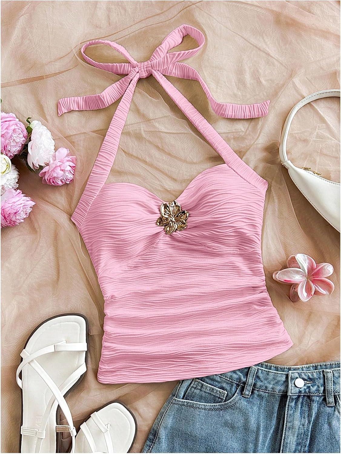SOLY HUX Women’s V Neck Halter Tops Open Back Y2k Ruched Floral Metal Summer Going Out Cami Tops(Solid Pink)