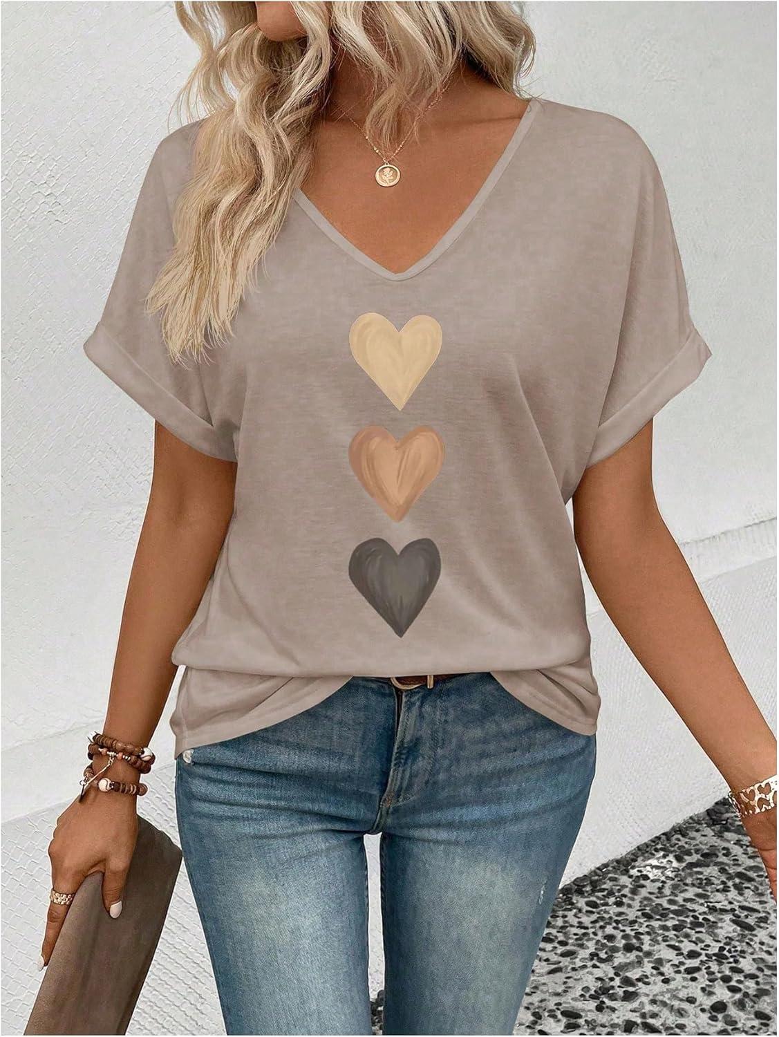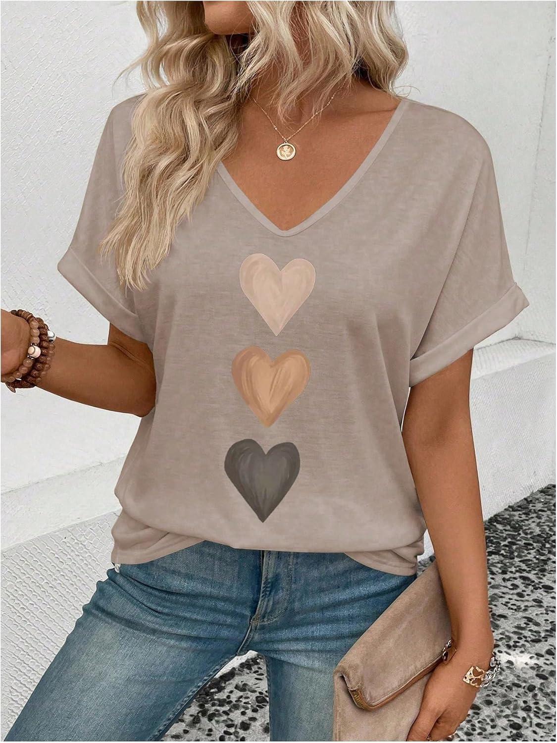 SOLY HUX Women’s V Neck Short Sleeve T Shirts Heart Graphic Tees Summer Classic Tops(Apricot Hearts)