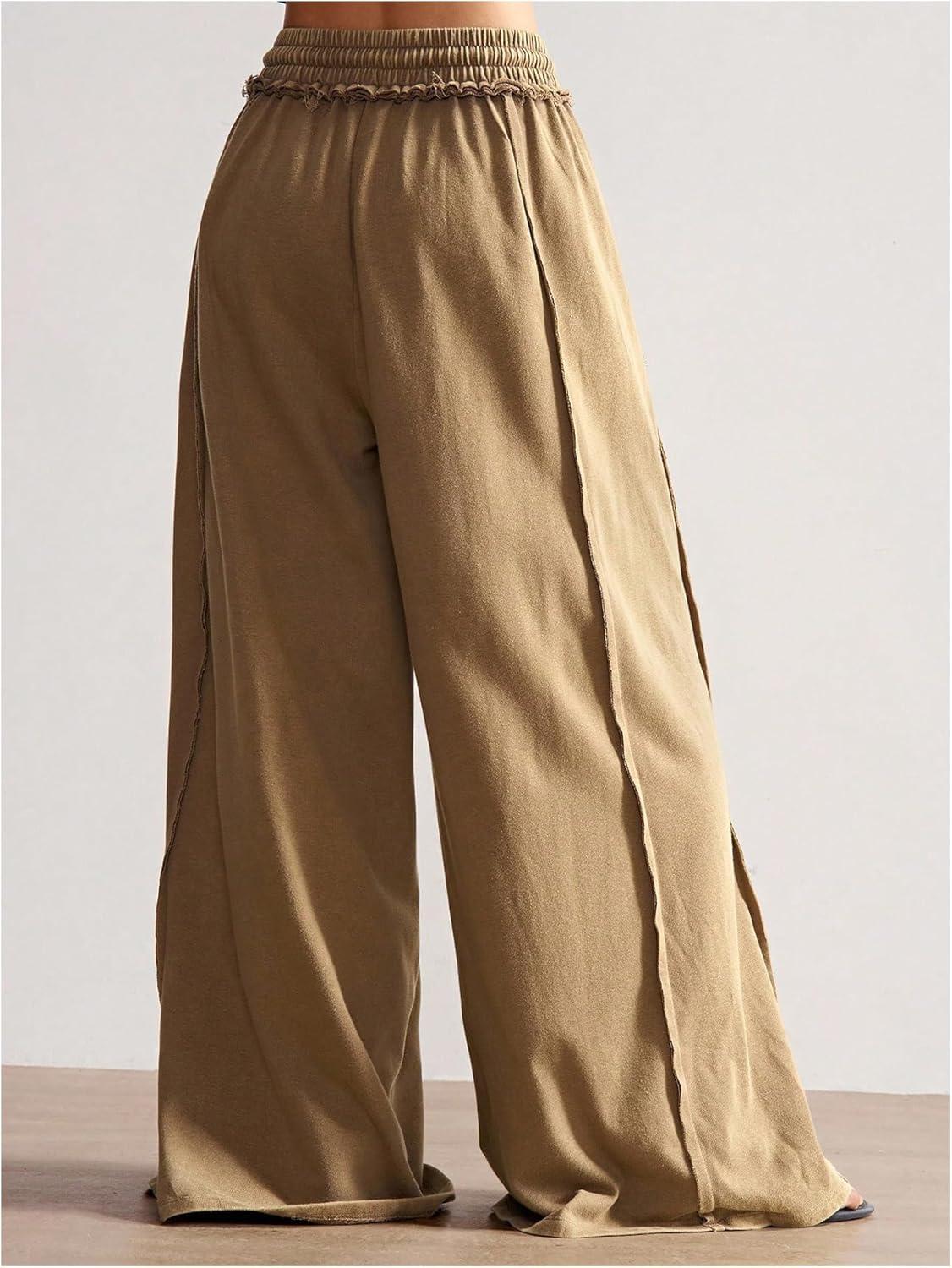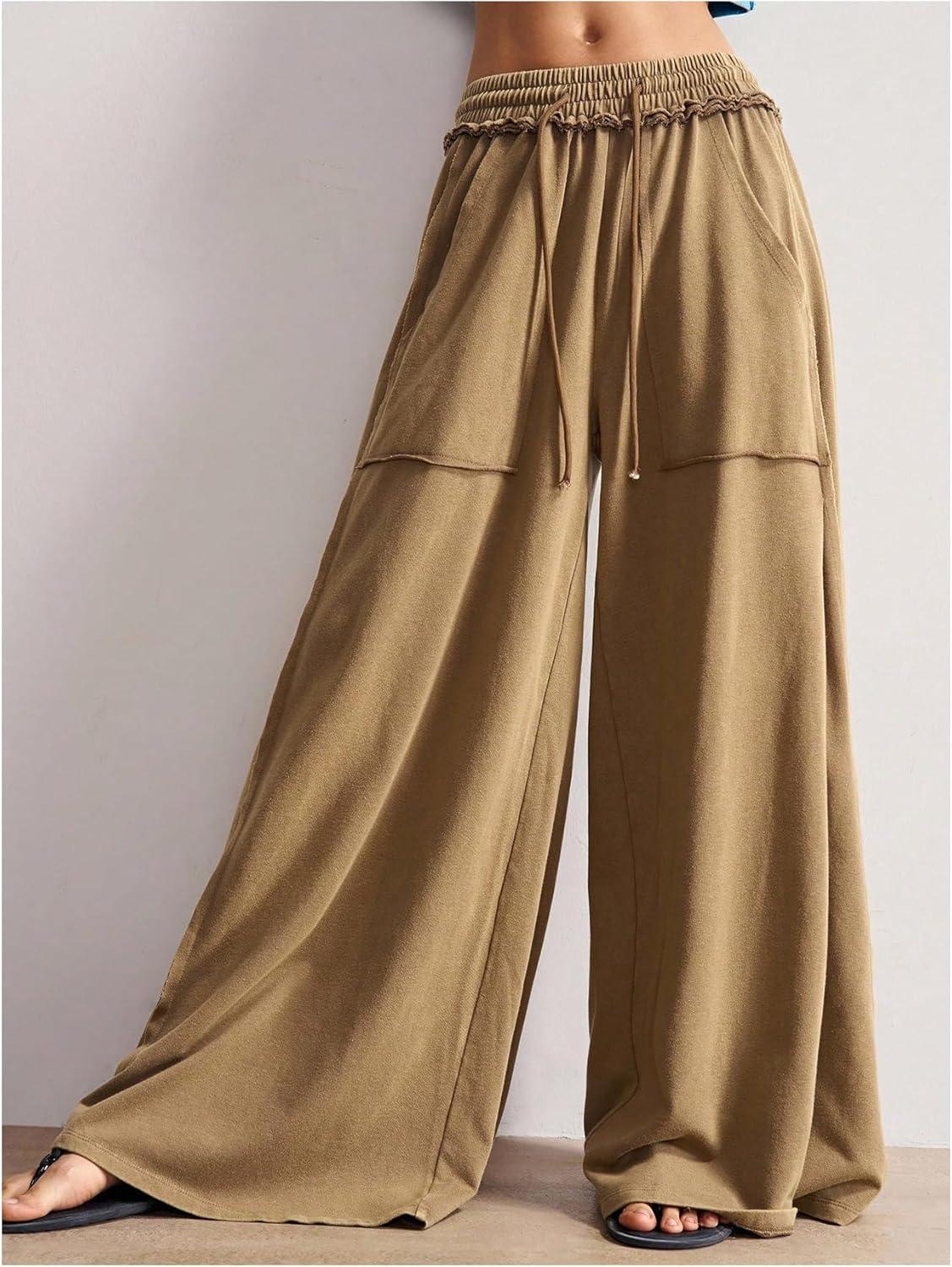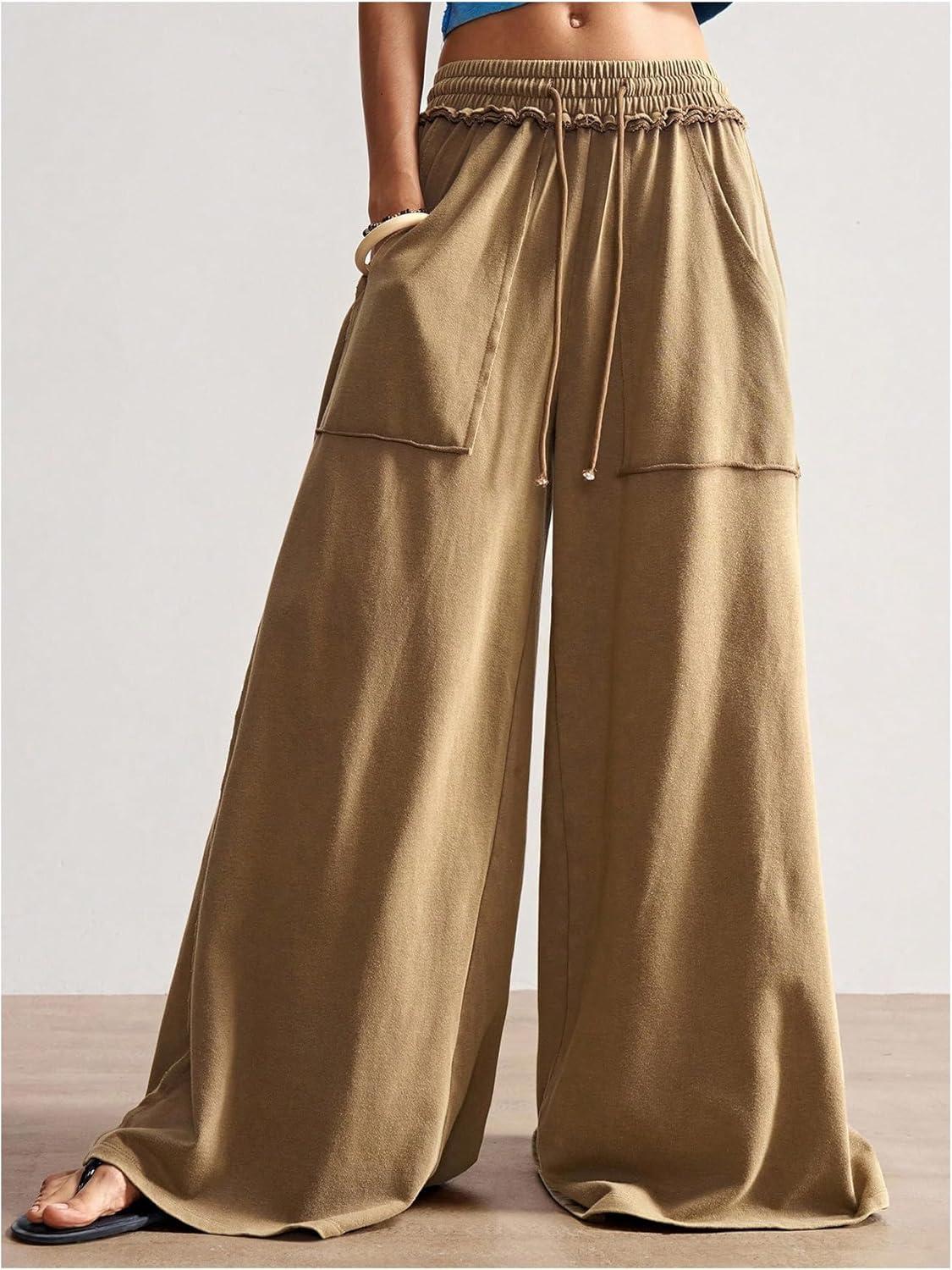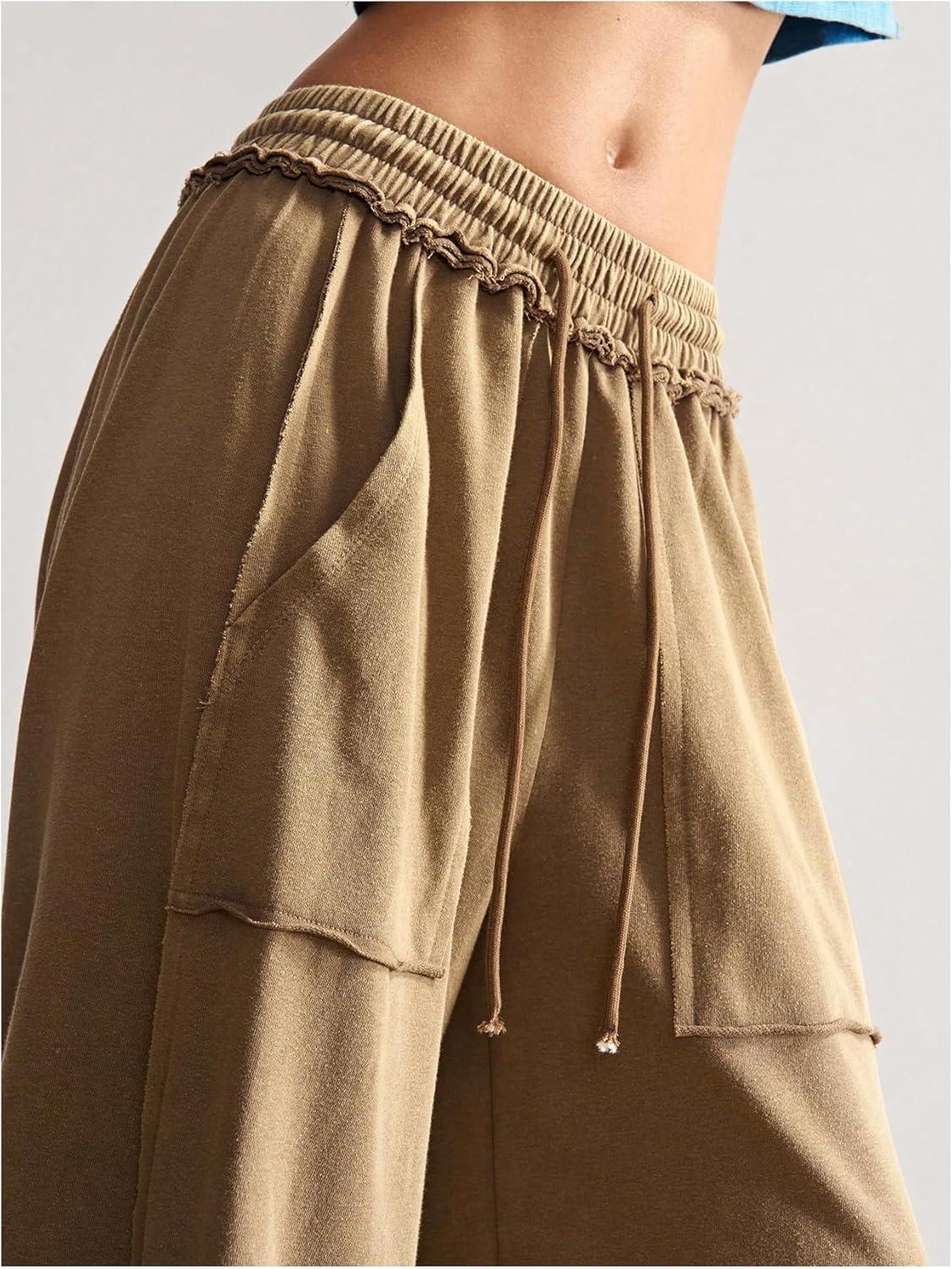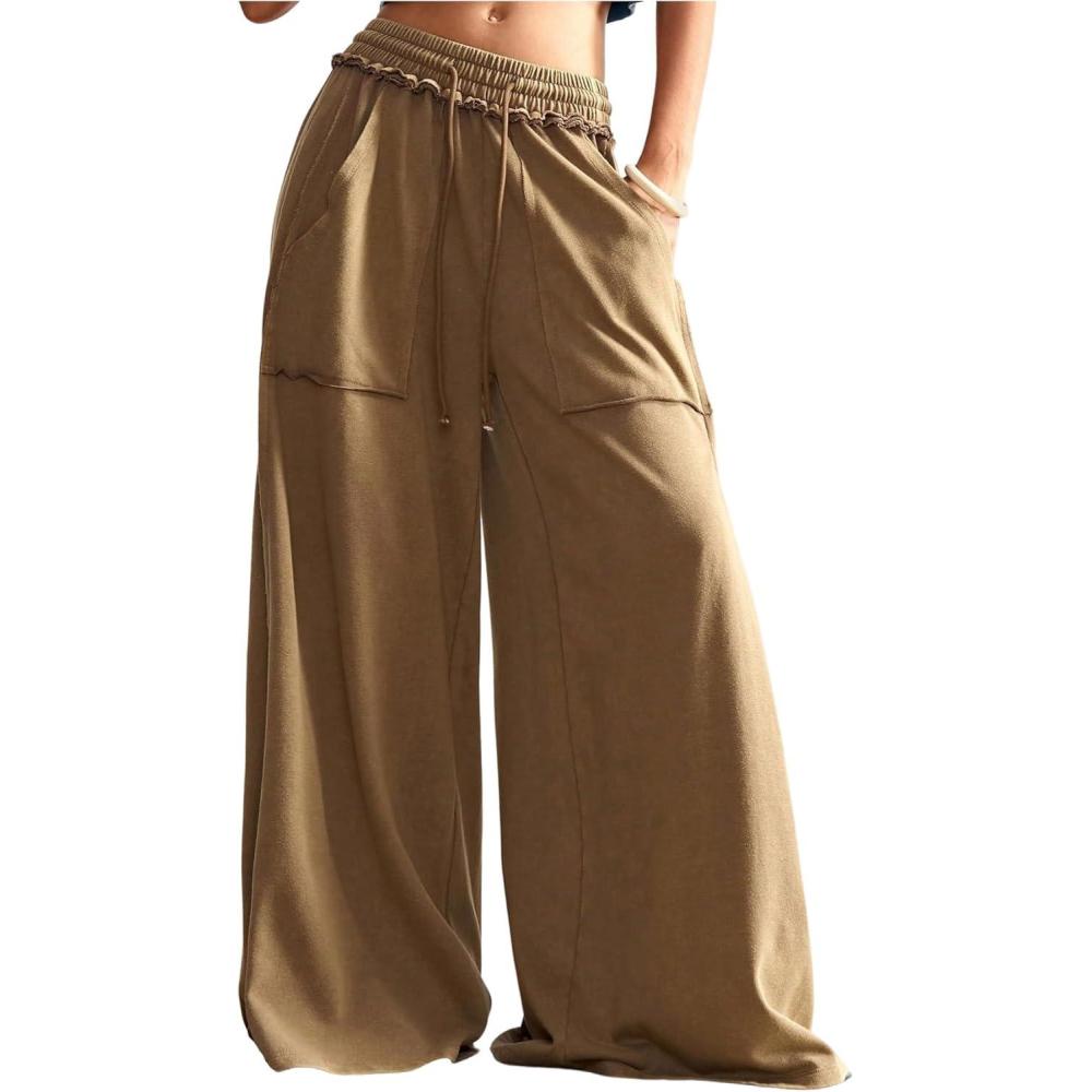 SOLY HUX Women’s Wide Leg Baggy Sweatpants Acid Wash Drawstring Elastic Waist Palazzo Long Pants with Pockets(Pure Brown)