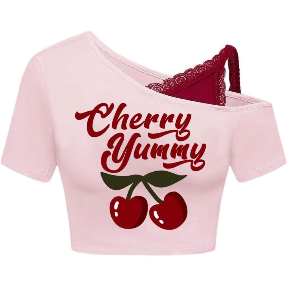 SOLY HUX Women’s Y2k Cherry Print Tees Crop Top Cute Graphic Short Sleeve Lace 2 in 1 T-Shirts(Pink Red)