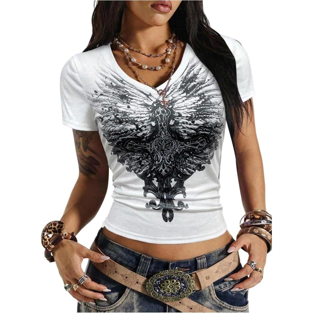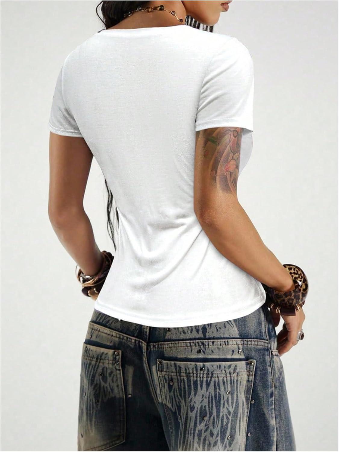 SOLY HUX Women’s Y2k Gothic Graphic Tees V Neck Short Sleeve T Shirt Streetwear Summer Tops(White Graphic)
