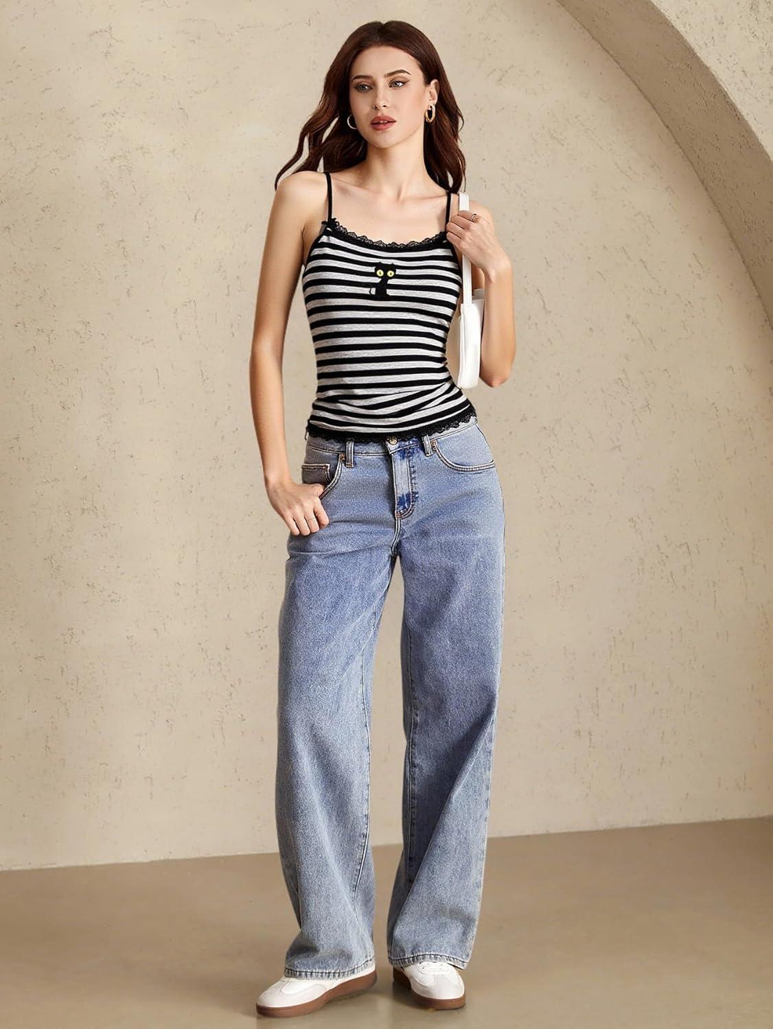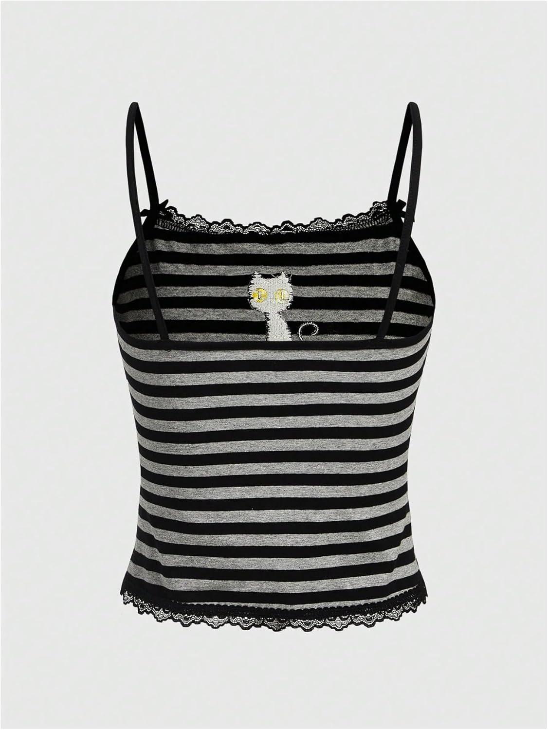 SOLY HUX Women’s Y2k Lace Striped Cami Crop Tops Spaghetti Strap Cat Embroidery Camisole(Dark Grey Cat)