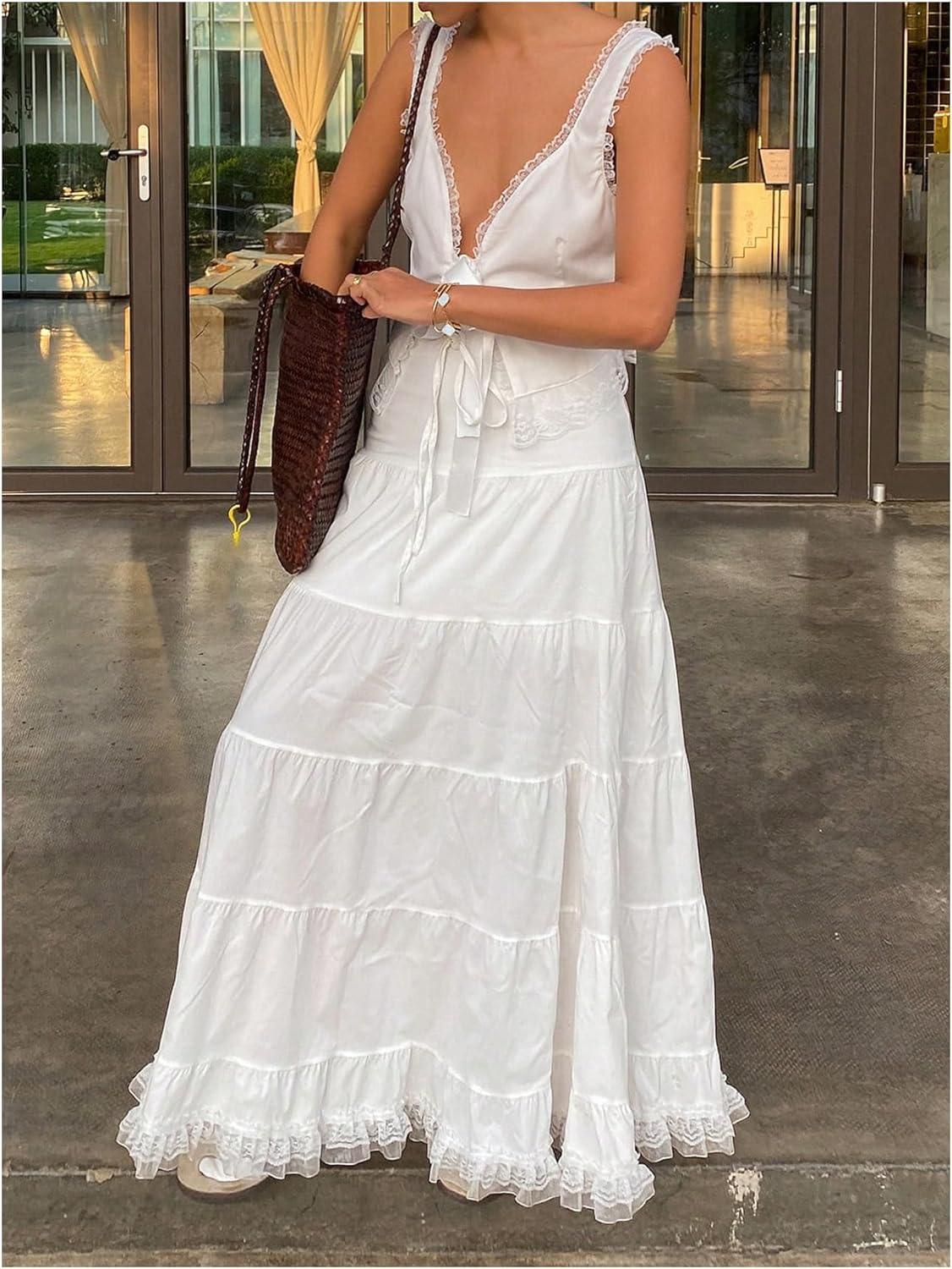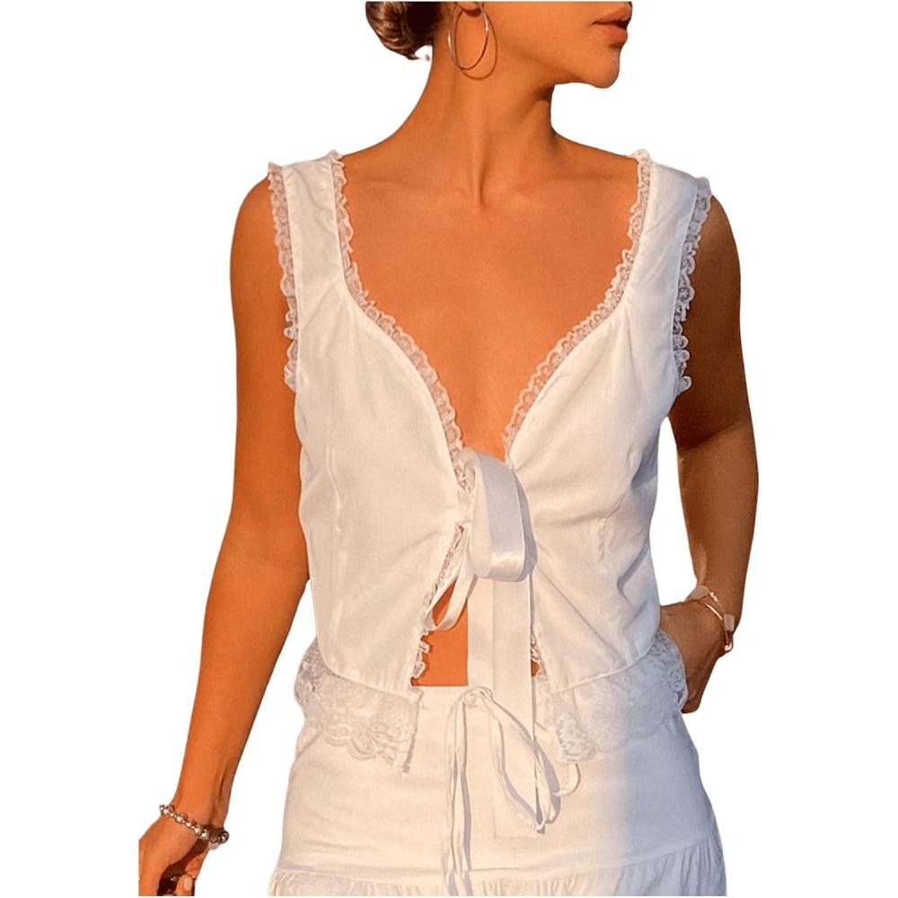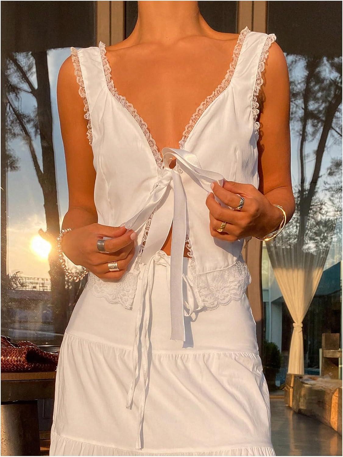 SOLY HUX Women’s Y2k Lace Trim Open Tie Front Tank Top V Neck Sleeveless Tops(Pure White)