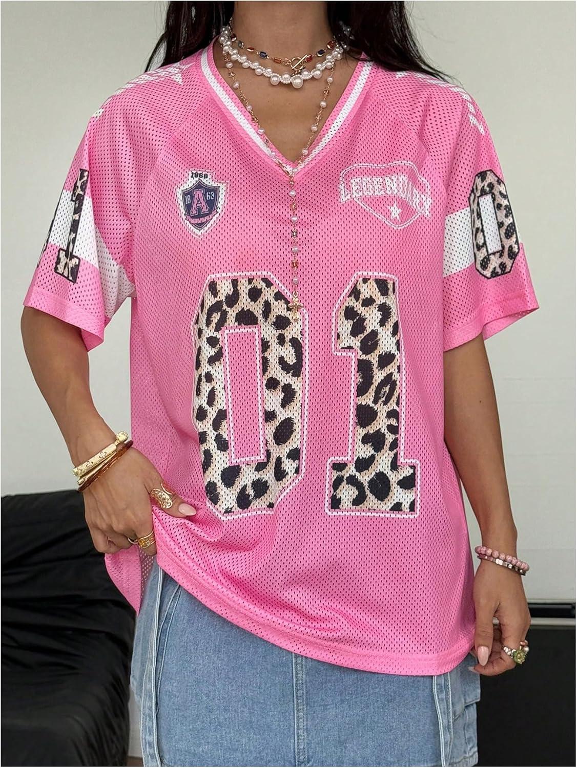 SOLY HUX Women’s Y2k Leopard Number Graphic Oversized Tops Football Jersey Shirts Streetwear(Pink Graphic)