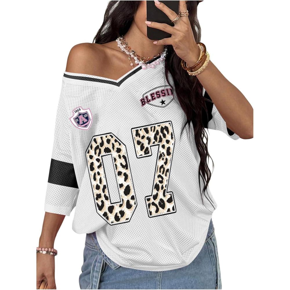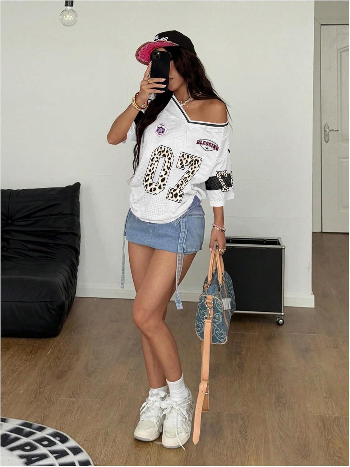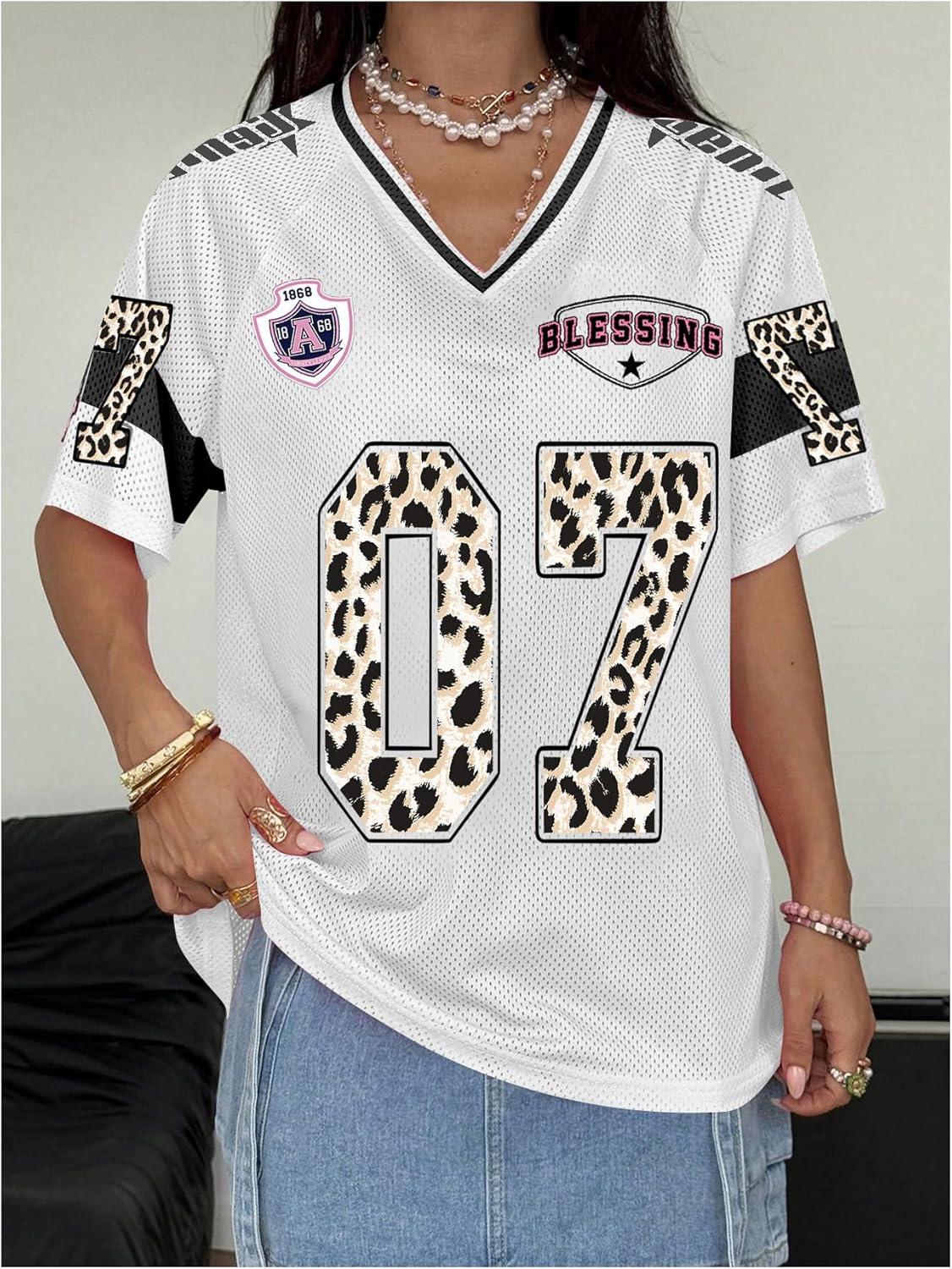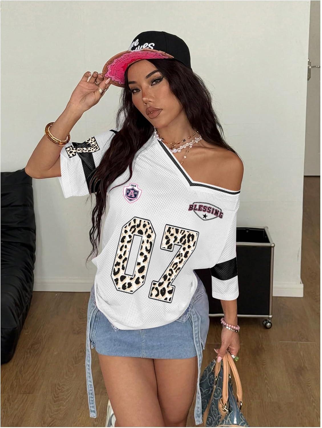 SOLY HUX Women’s Y2k Leopard Number Graphic Oversized Tops Football Jersey Shirts Streetwear(White Graphic)