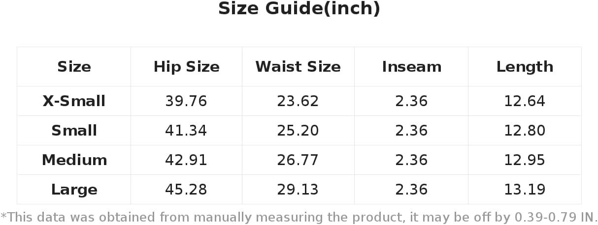 XS:Waist Size:23.6IN,Hip Size:39.8IN,Inseam:2.4IN,Length:12.6IN