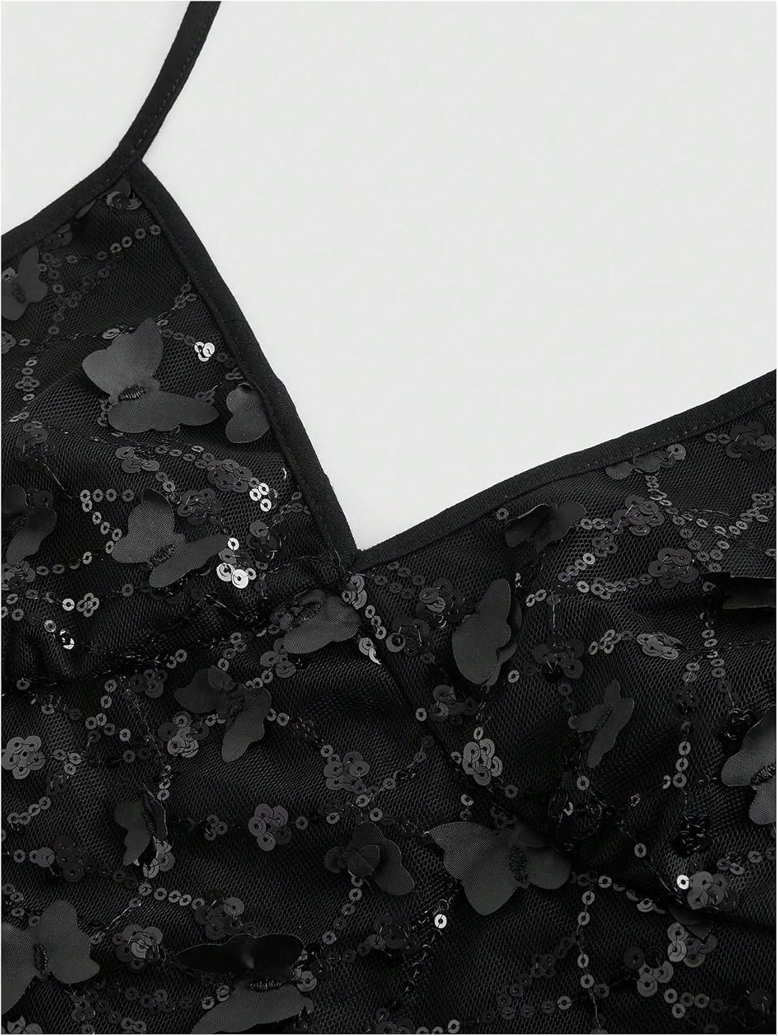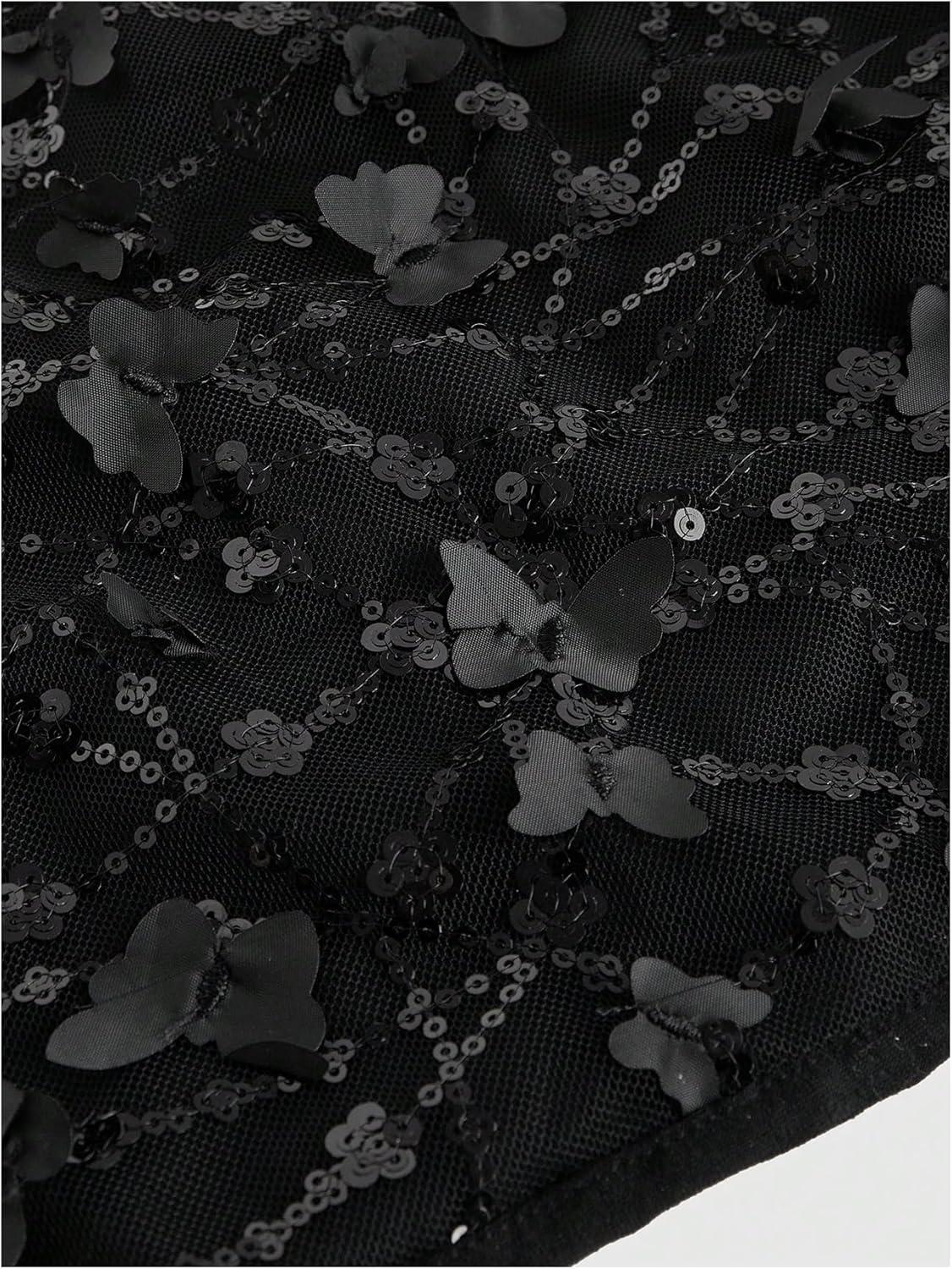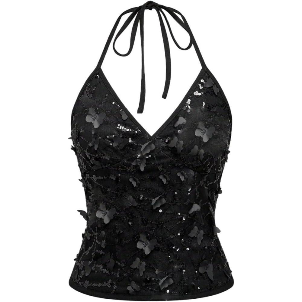 SOLY HUX Women’s Y2k Sequin Halter Crop Top Cute 3D Butterfly Glitter Coquette Party Club Tops(Pure Black)