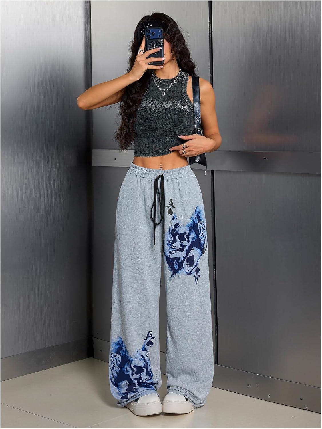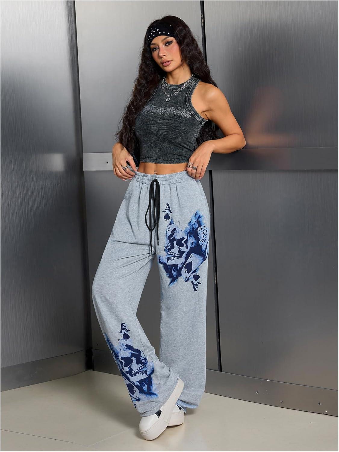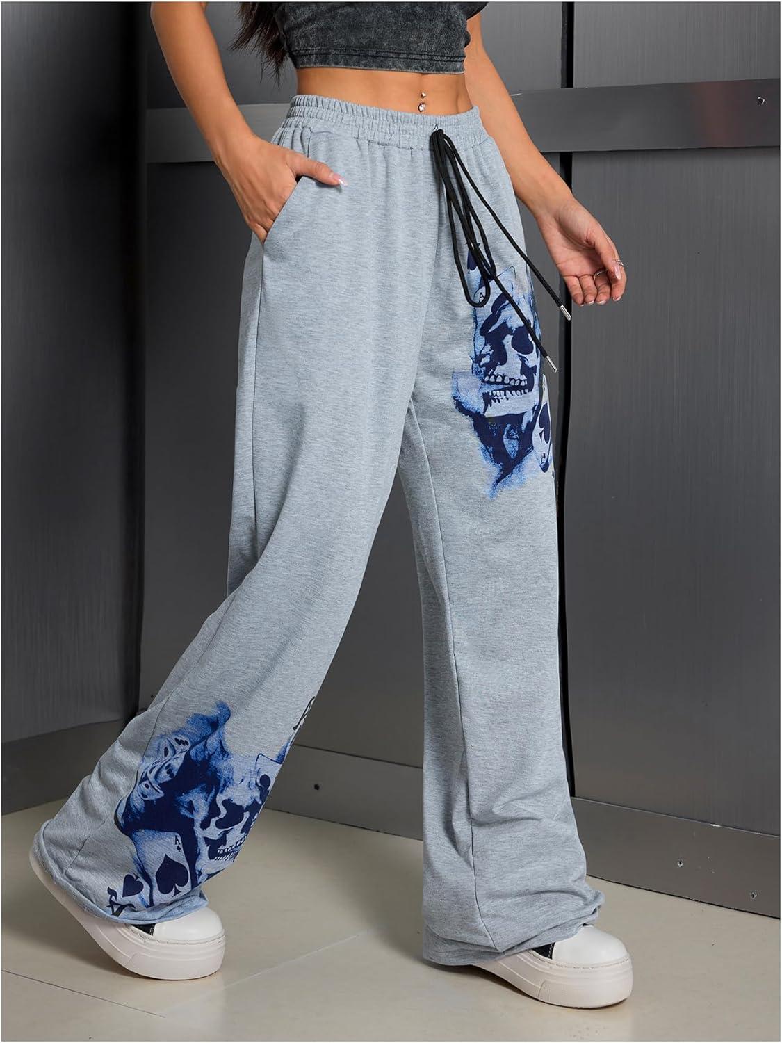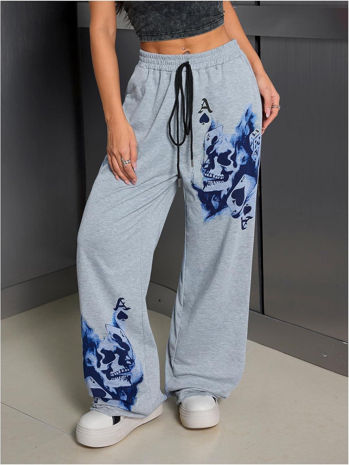 SOLY HUX Women’s Y2k Sweatpants Drawstring Waist Wide Leg Gothic Grunge Pants Streetwear(Grey Graphic)