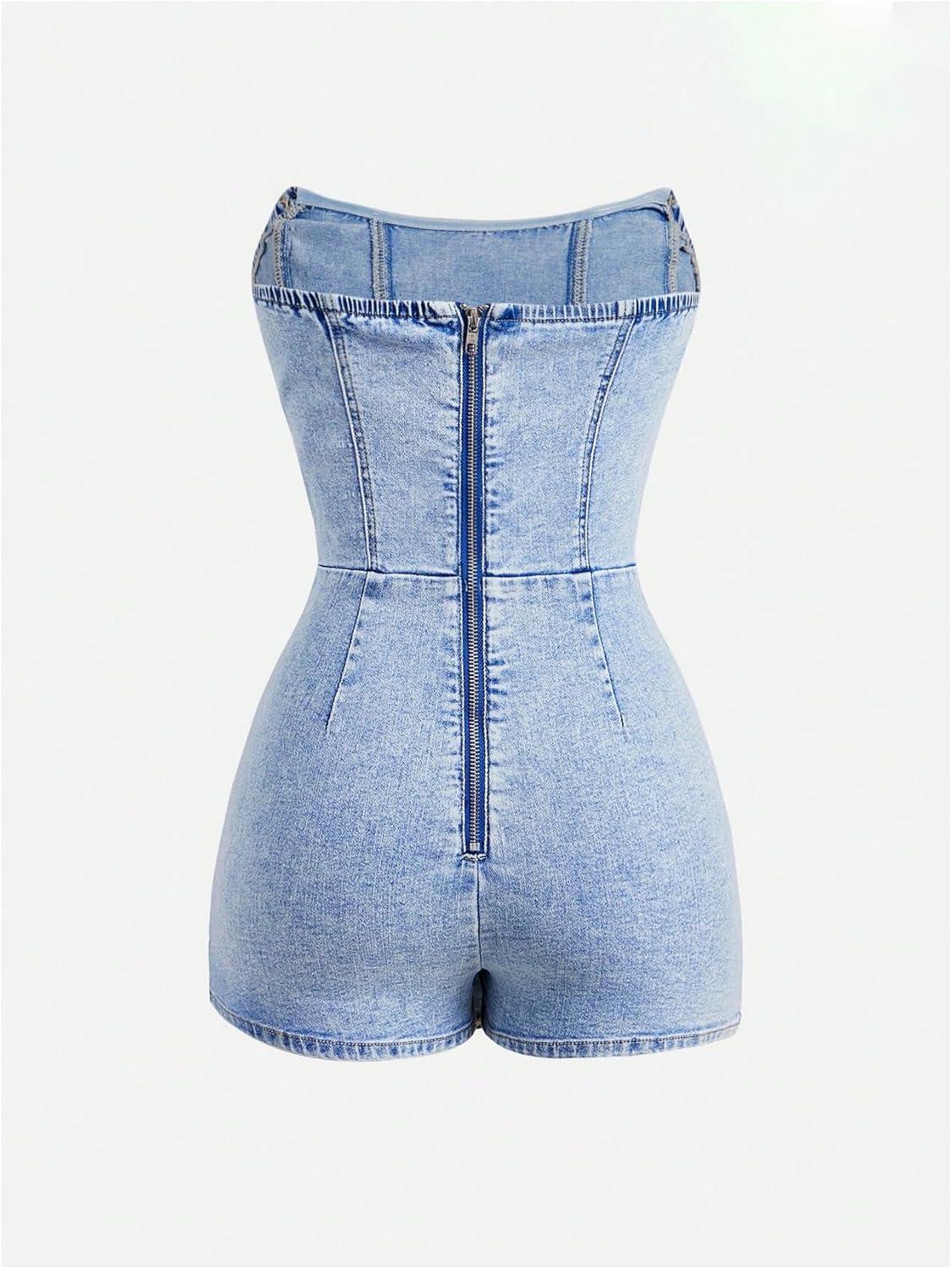 SOLY HUX Women’s Y2k Tube Top Denim Romper Wrap Strapless Bodycon Short Jumpsuits(Pure Blue)