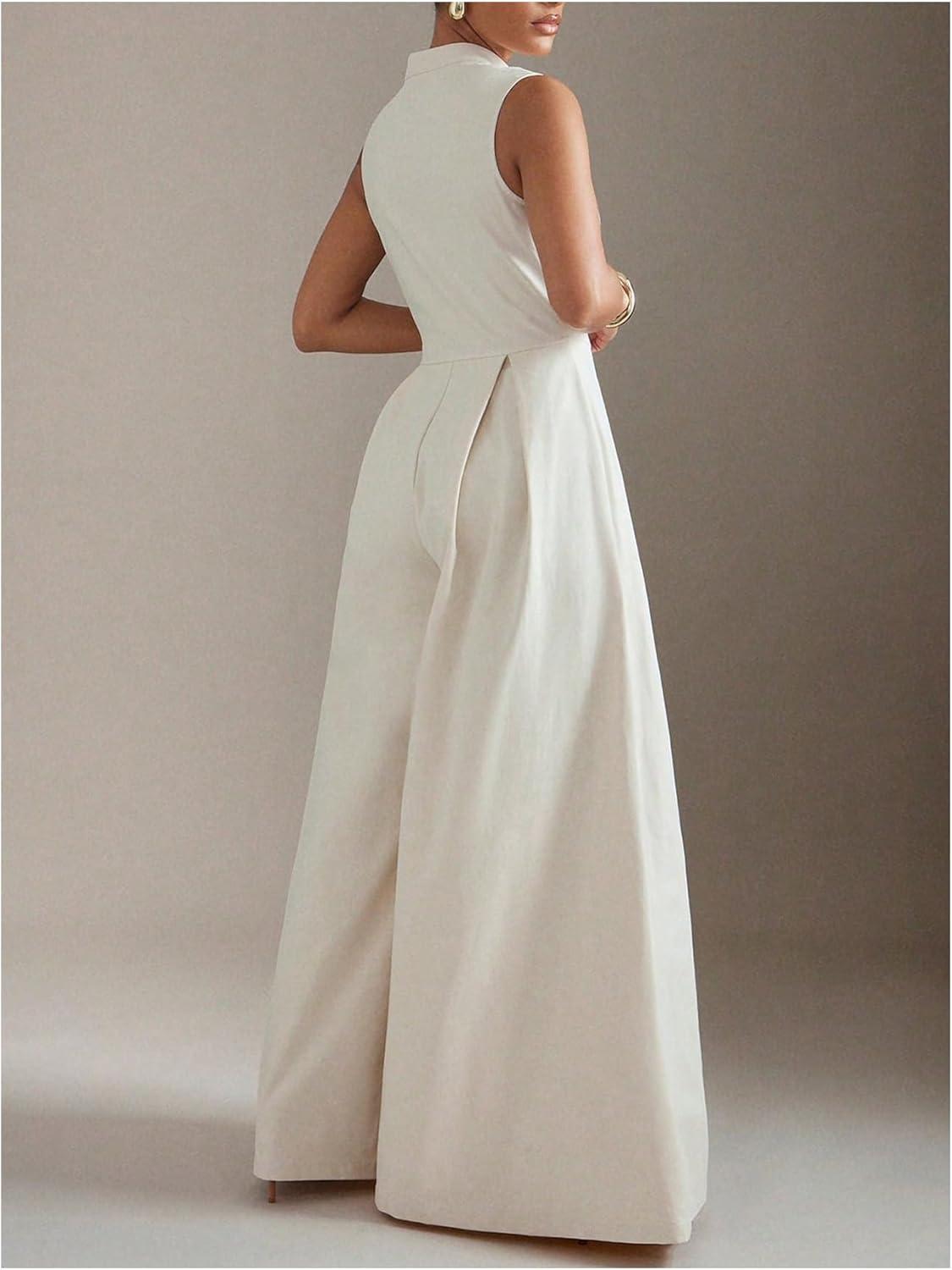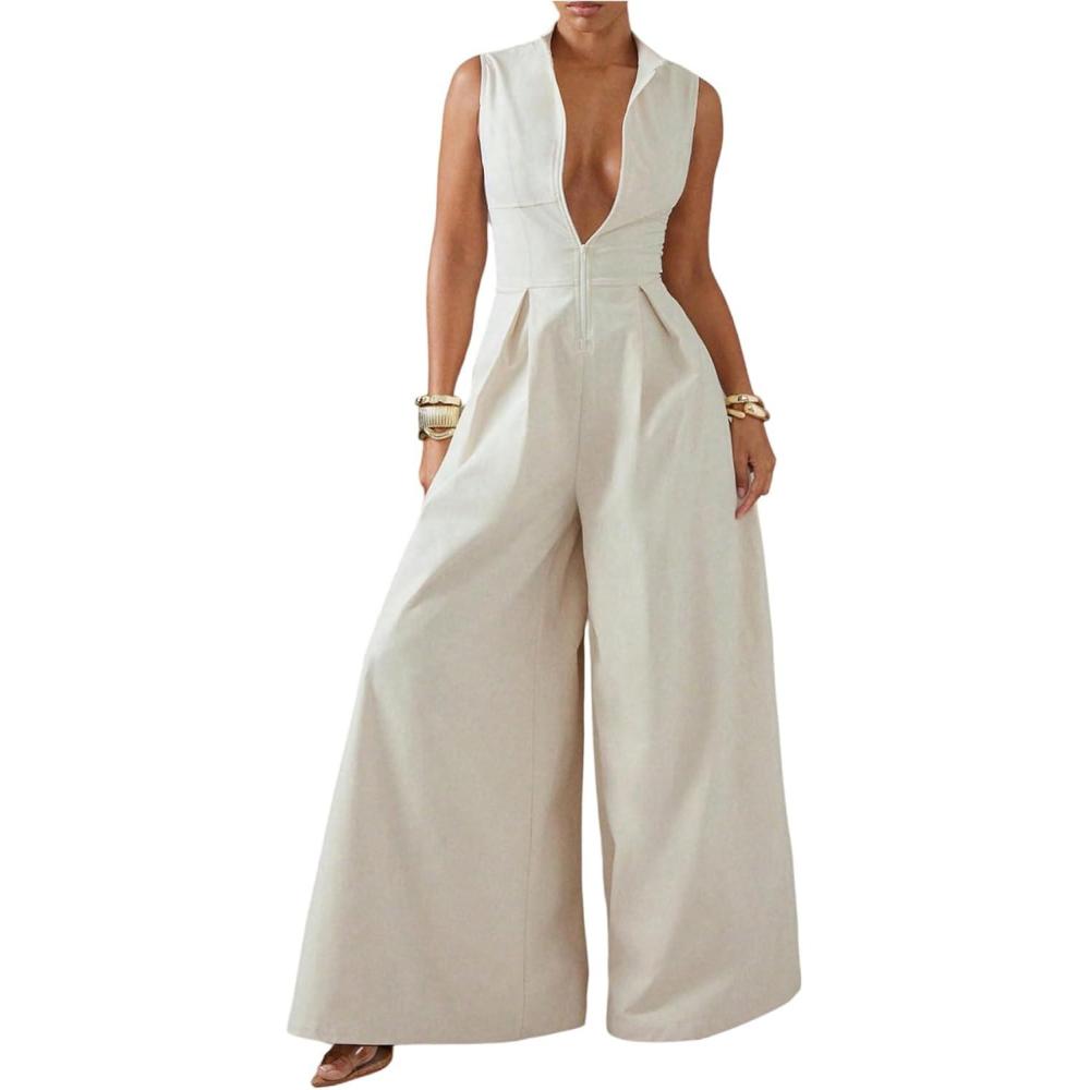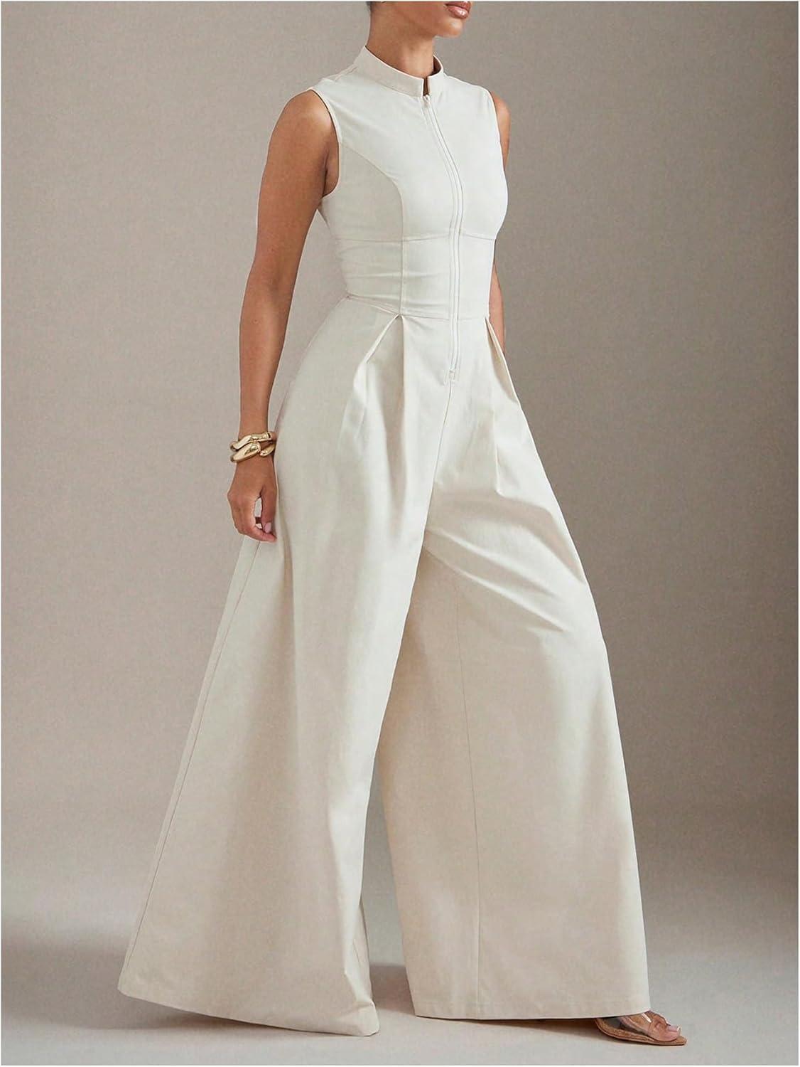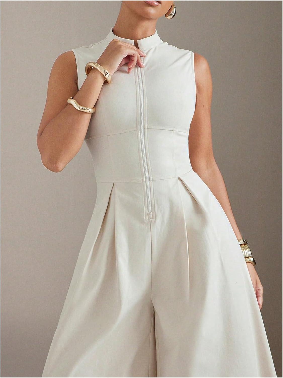 SOLY HUX Women’s Zipper Front Wide Leg Jumpsuit Summer Mock Neck Sleeveless Elegant Romper(Plain Apricot)