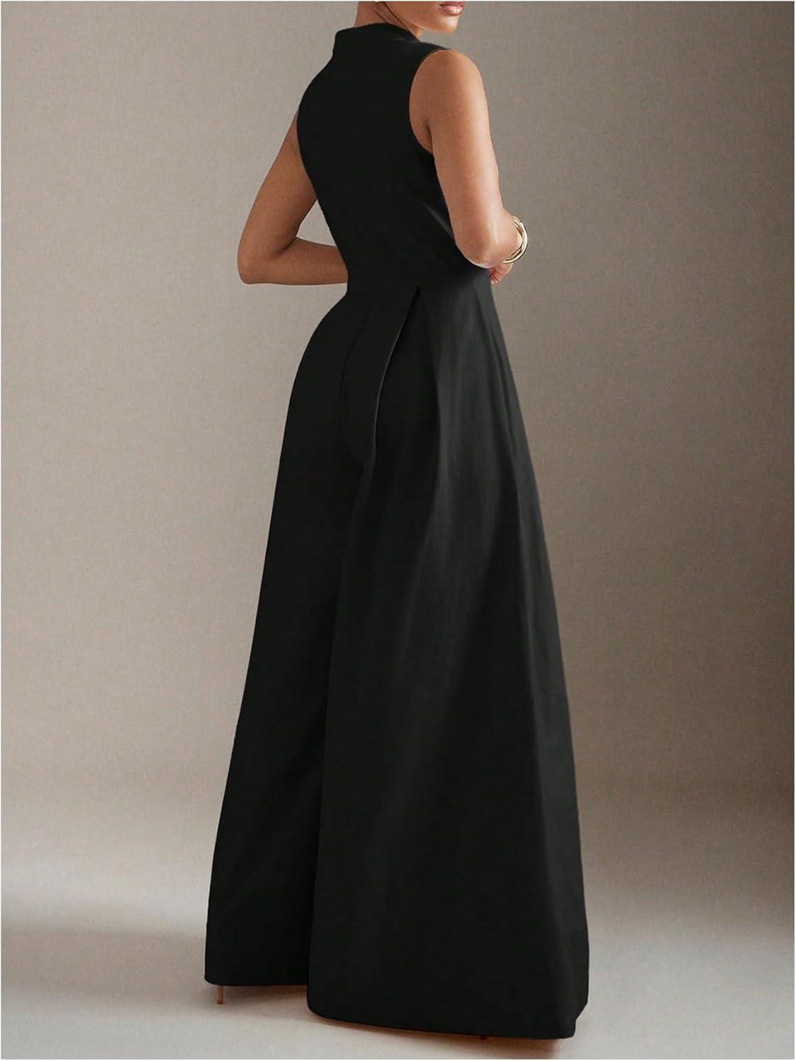 SOLY HUX Women’s Zipper Front Wide Leg Jumpsuit Summer Mock Neck Sleeveless Elegant Romper(Pure Black)