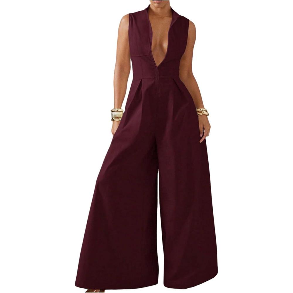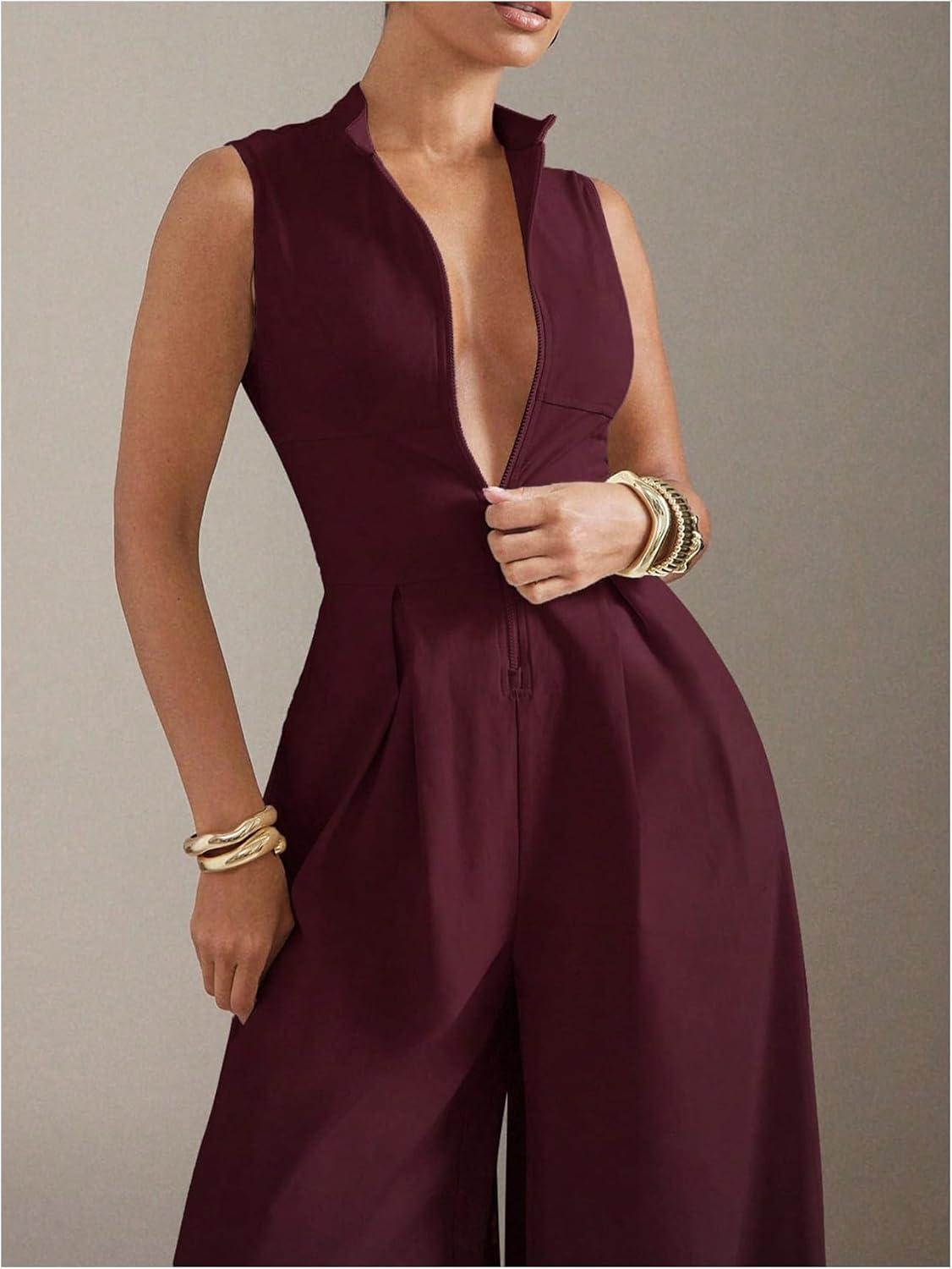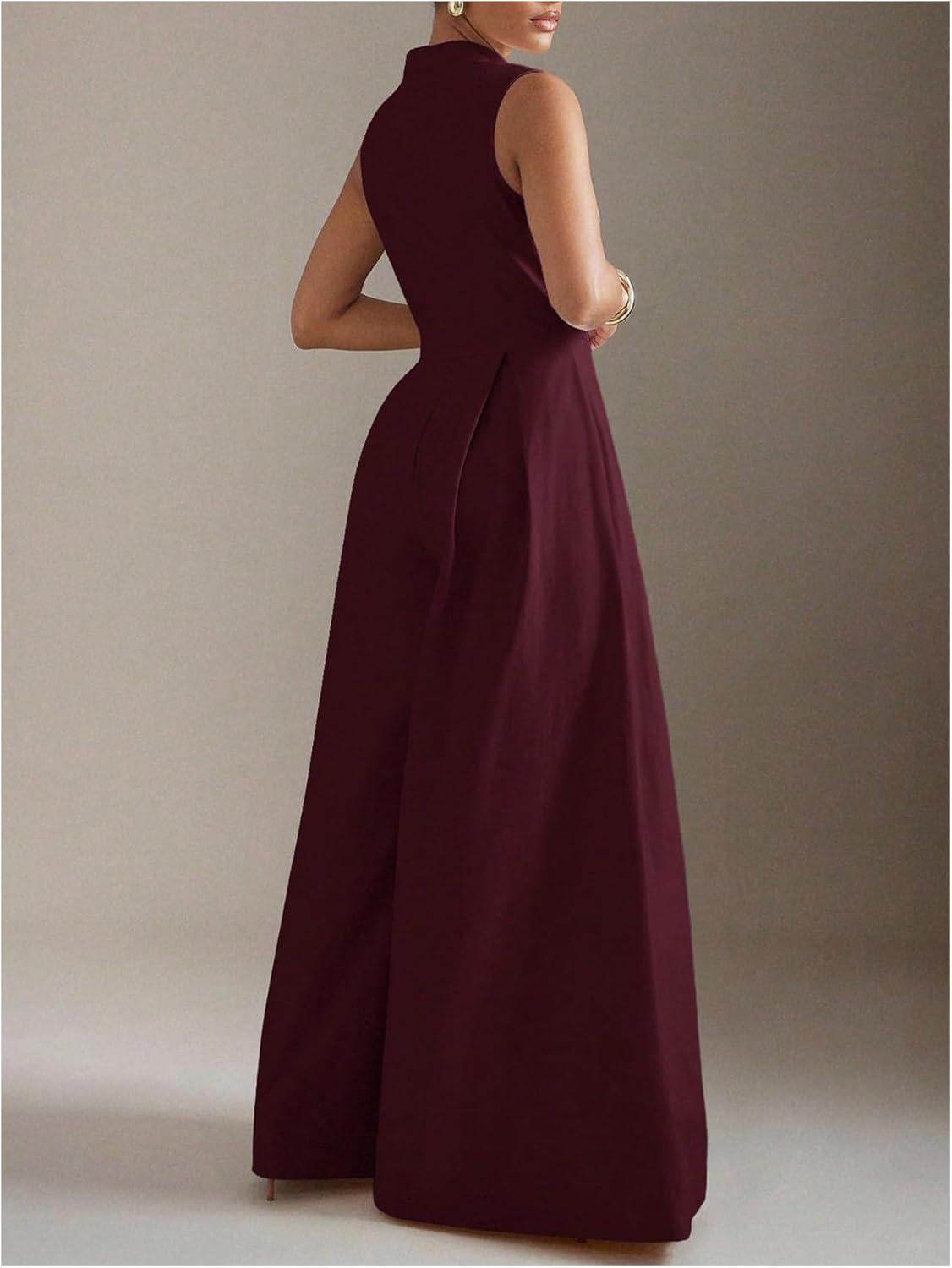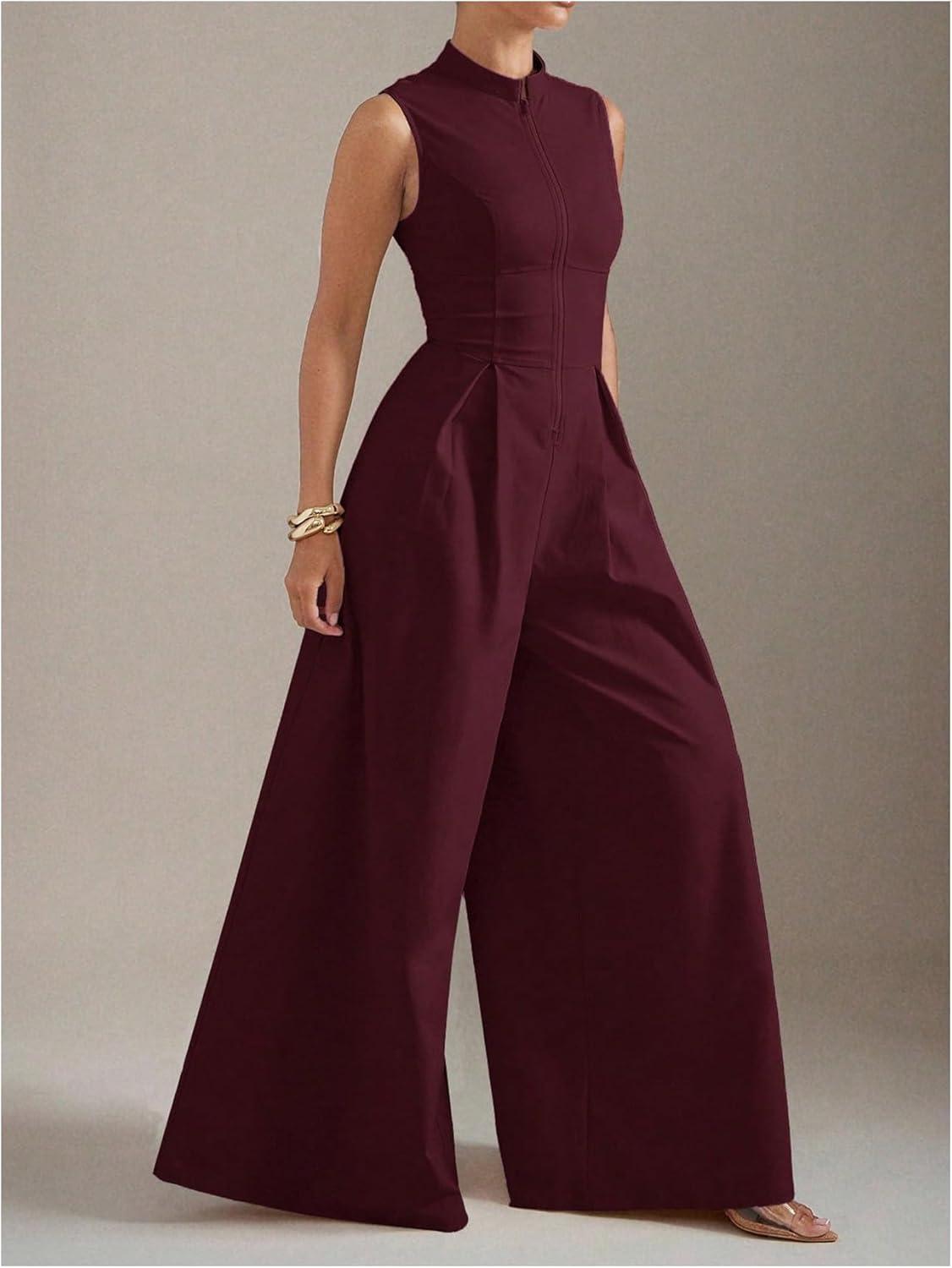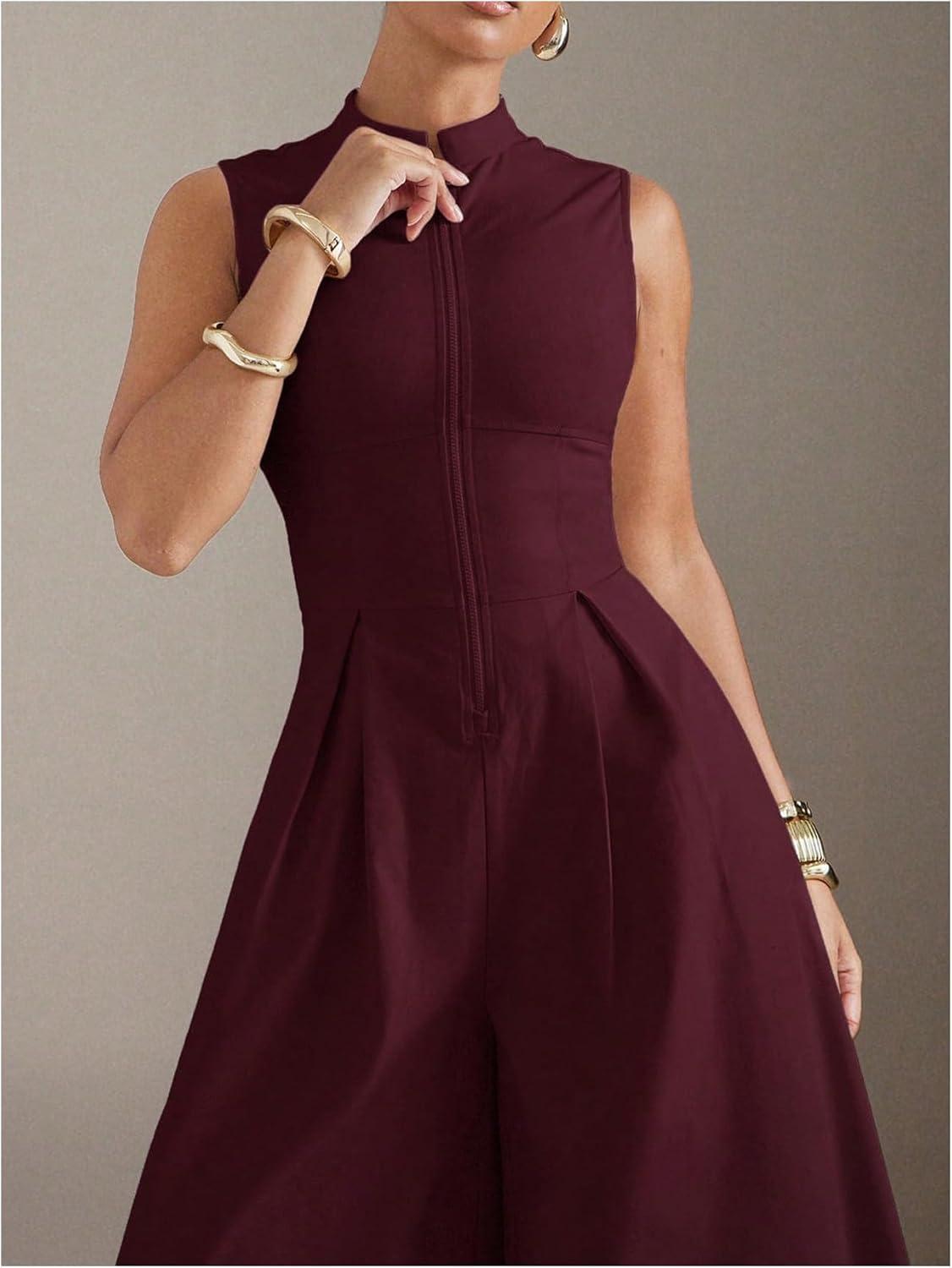 SOLY HUX Women’s Zipper Front Wide Leg Jumpsuit Summer Mock Neck Sleeveless Elegant Romper(Pure Burgundy)