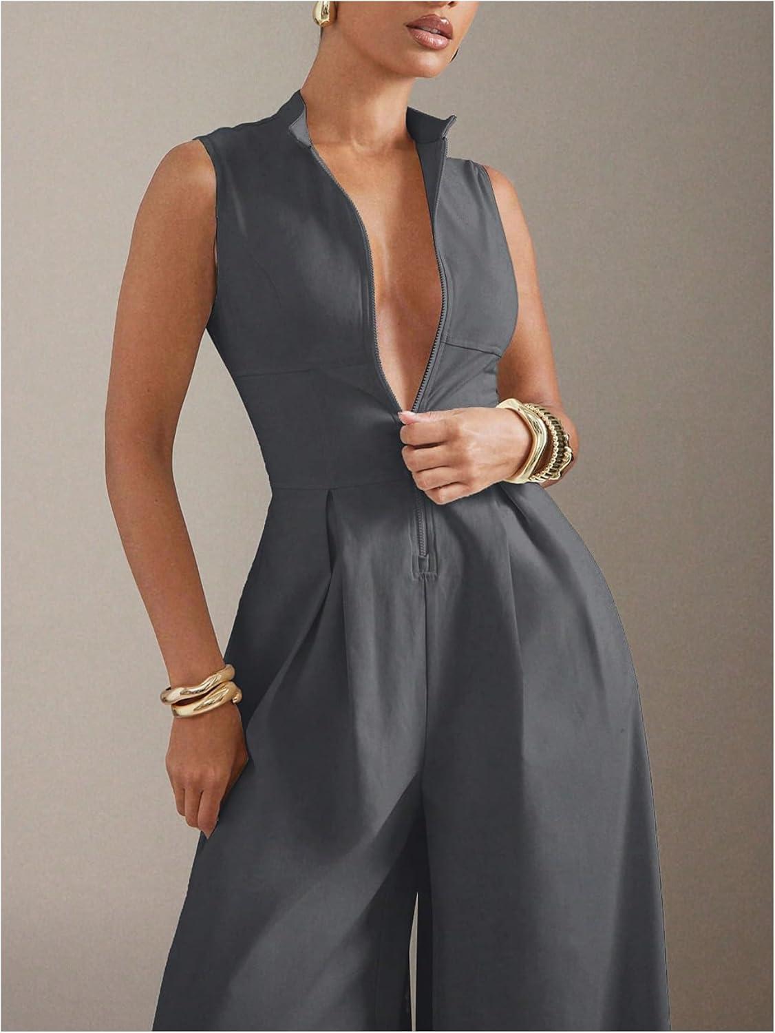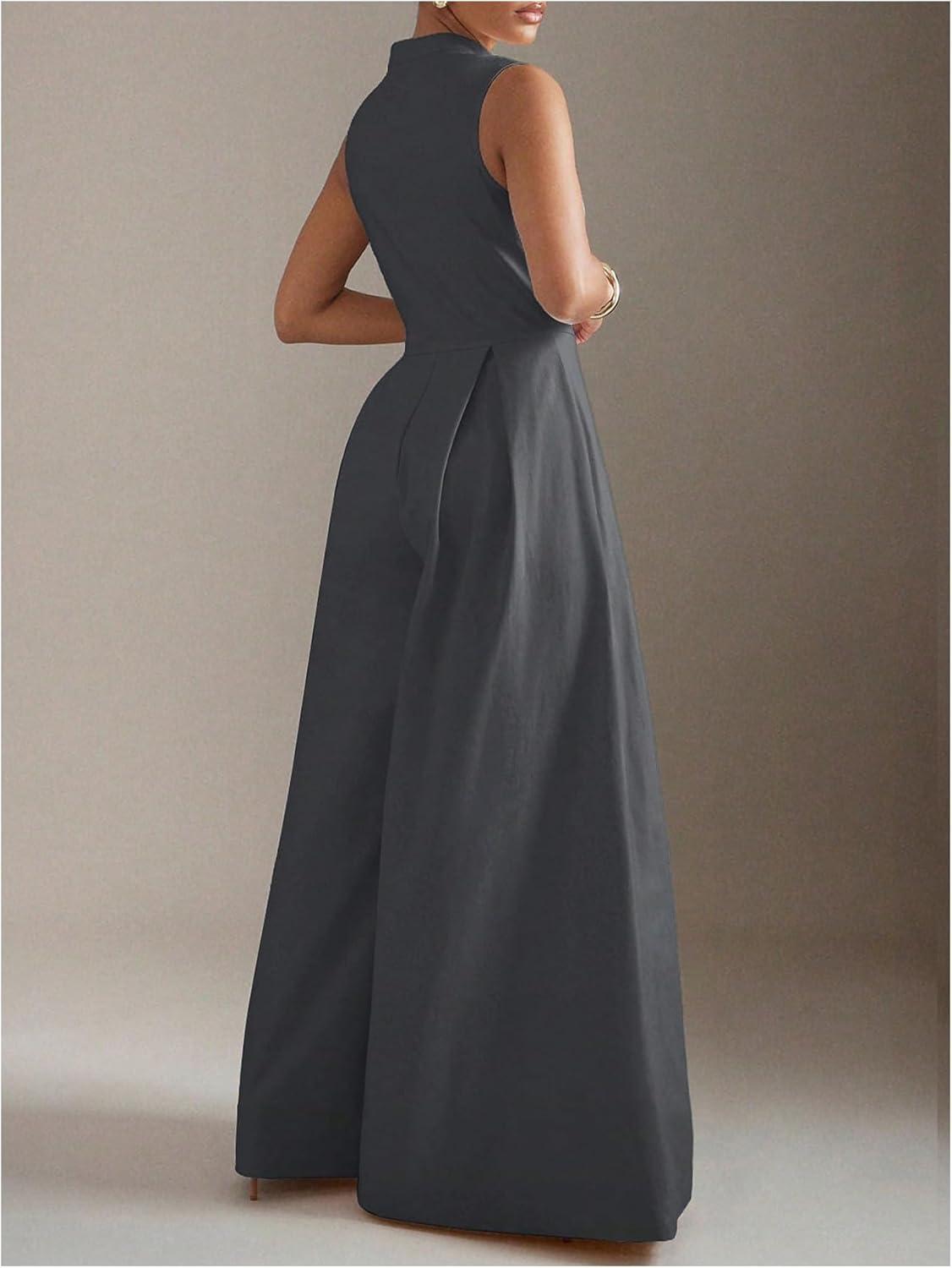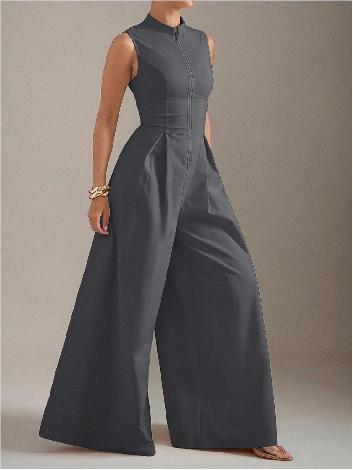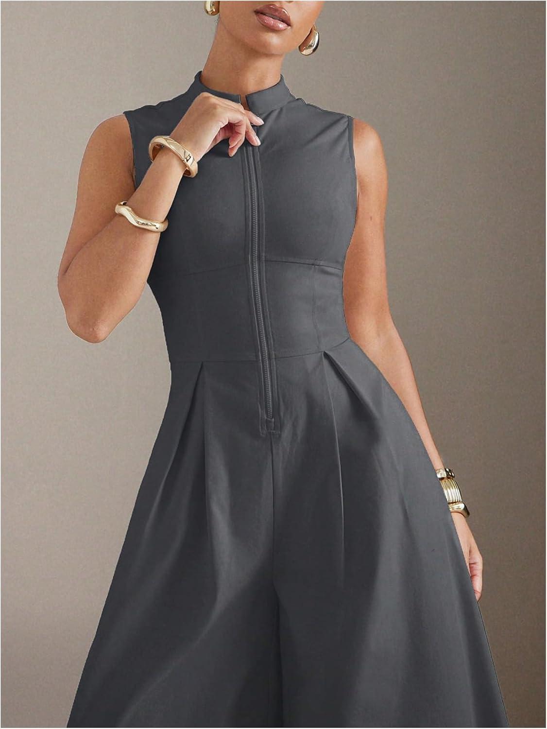 SOLY HUX Women’s Zipper Front Wide Leg Jumpsuit Summer Mock Neck Sleeveless Elegant Romper(Pure Dark Grey)