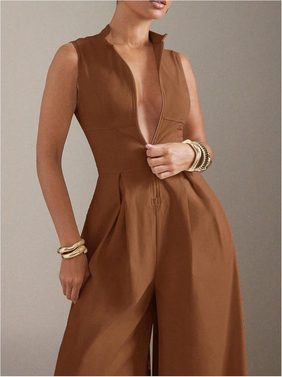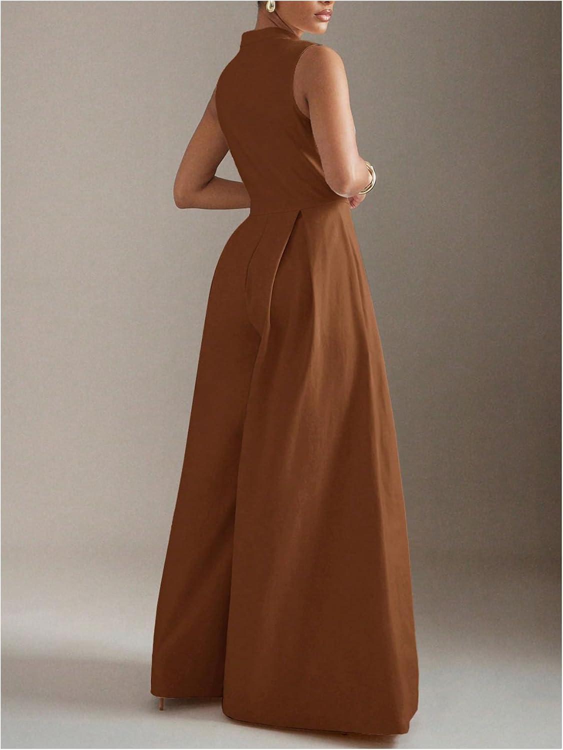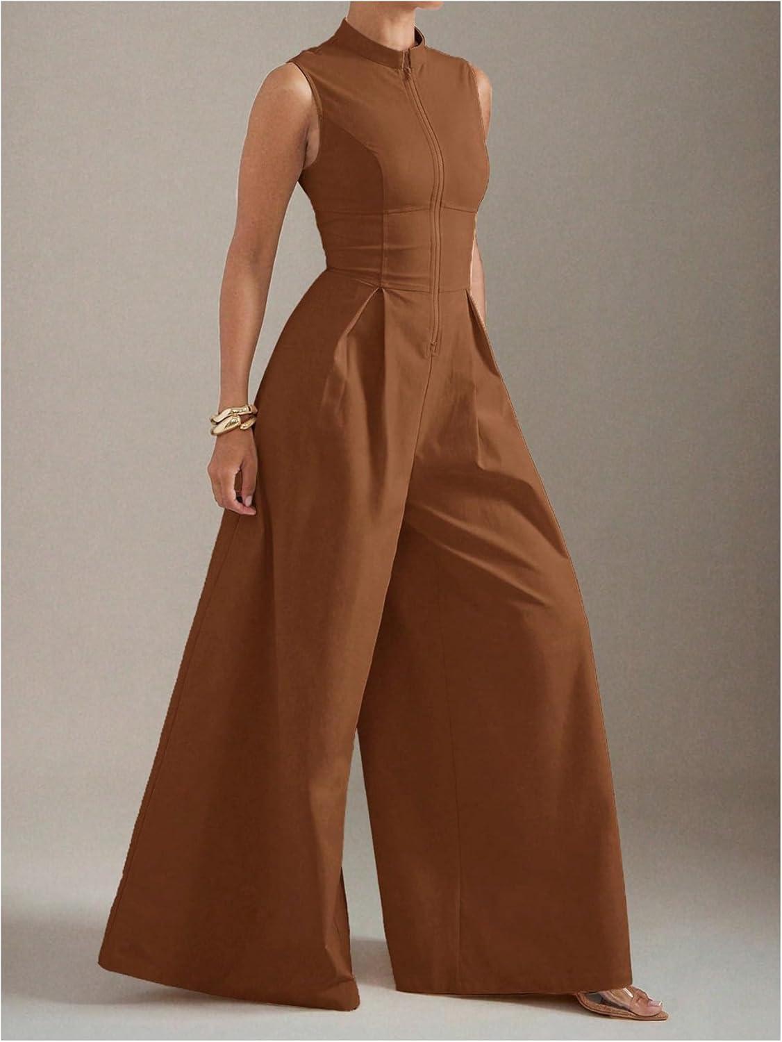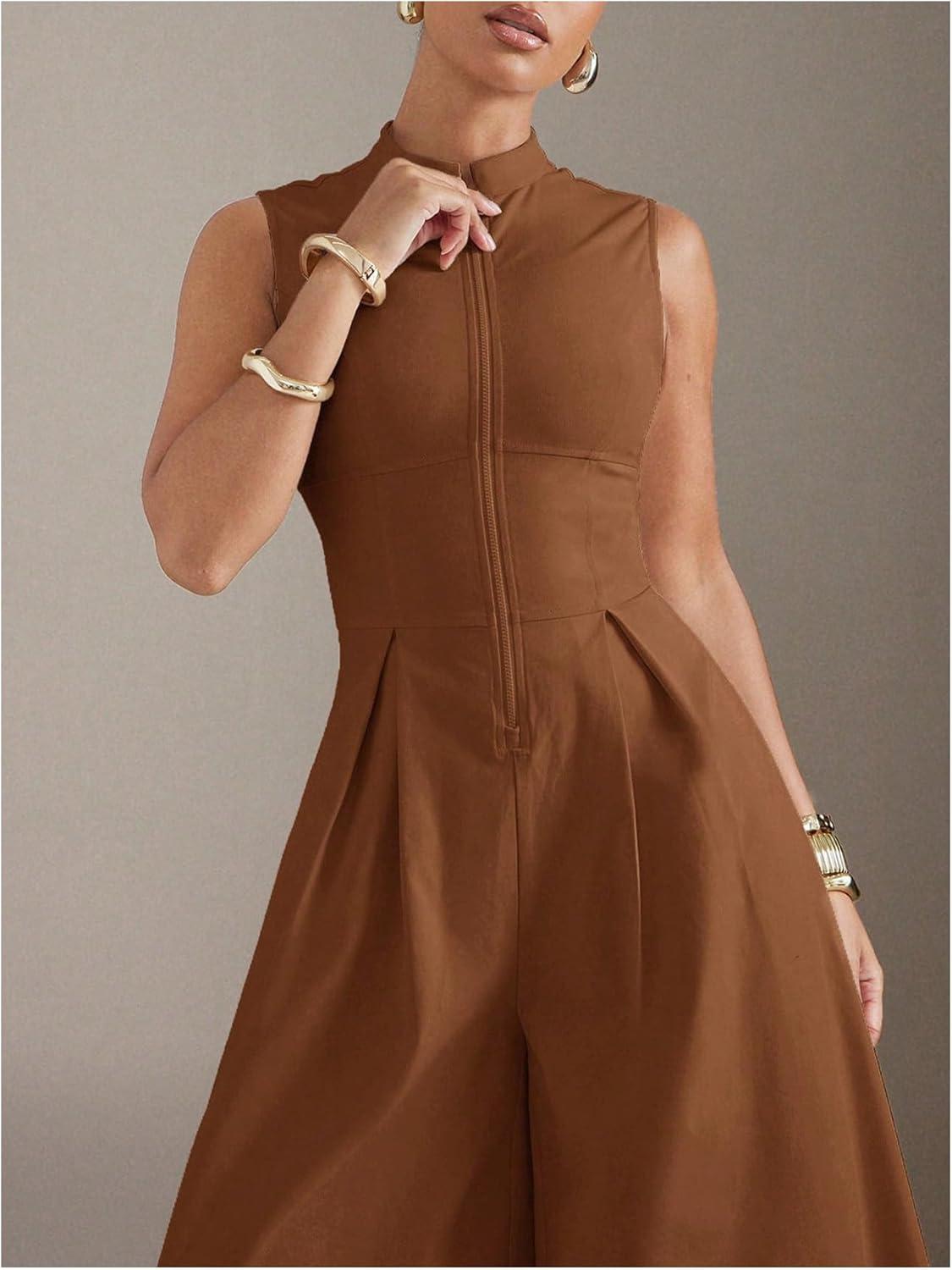 SOLY HUX Women’s Zipper Front Wide Leg Jumpsuit Summer Mock Neck Sleeveless Elegant Romper(Pure Rust Brown)